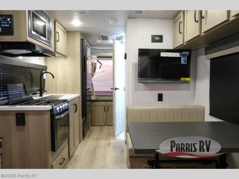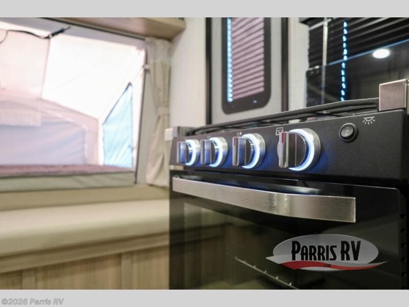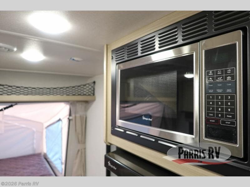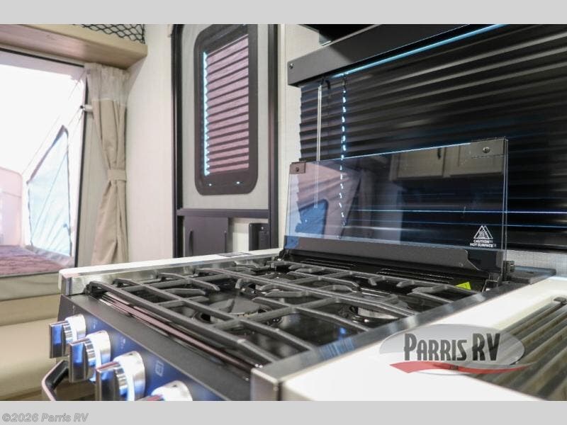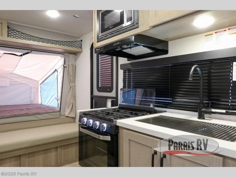 This expandable travel trailer is perfect for camping trips to your favorite park. You will find two queen tent end beds for cozy sleeping space plus a 39" booth dinette that will double as dining and additional sleeping space. There is also an entryway bench so you can easily pull your boots on for hiking. The three burner gas cooktop and microwave oven will let you make meals each day, and the 12V refrigerator will keep your food fresh. There is even a pantry/wardrobe that can store dry goods and clothes. Head outside to find Solid Step entry steps, an exterior griddle, a 12' power awning with LED lights and exterior storage!