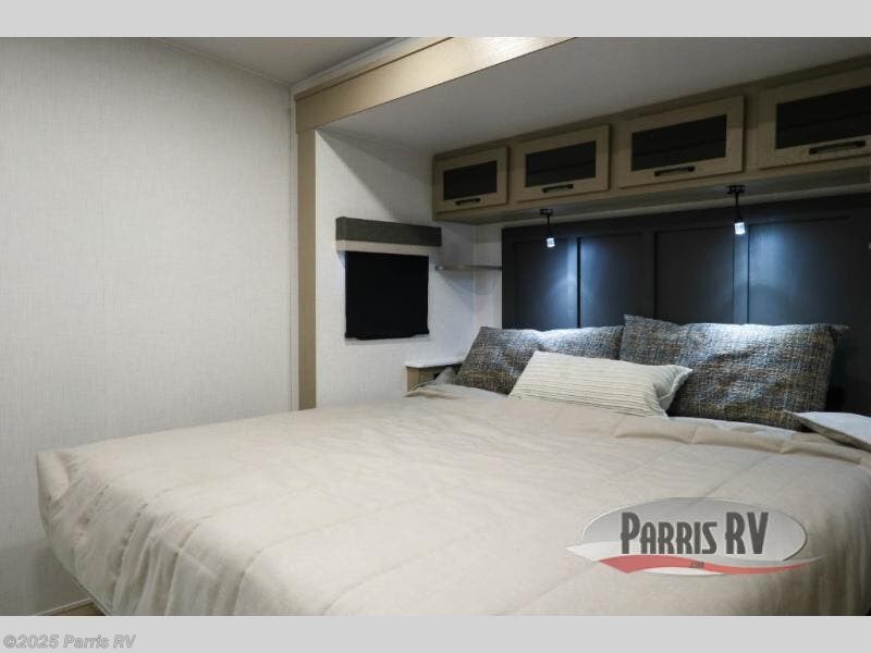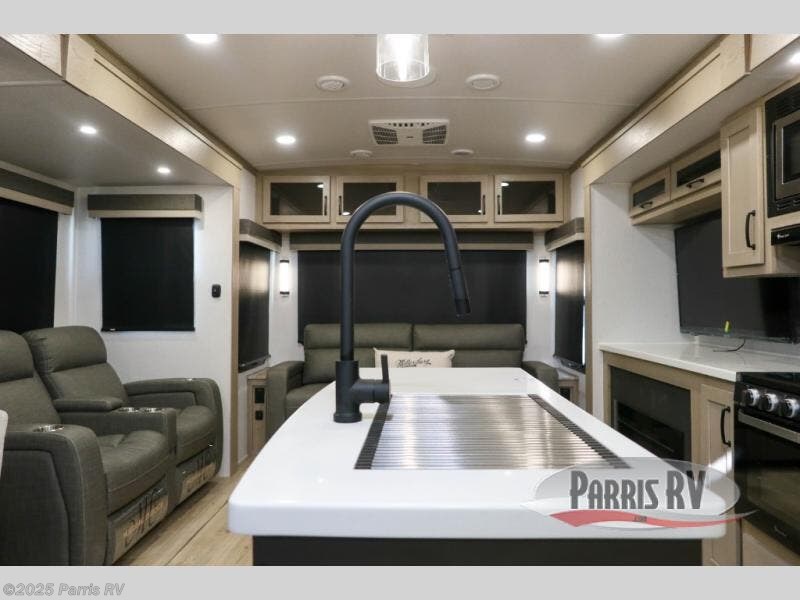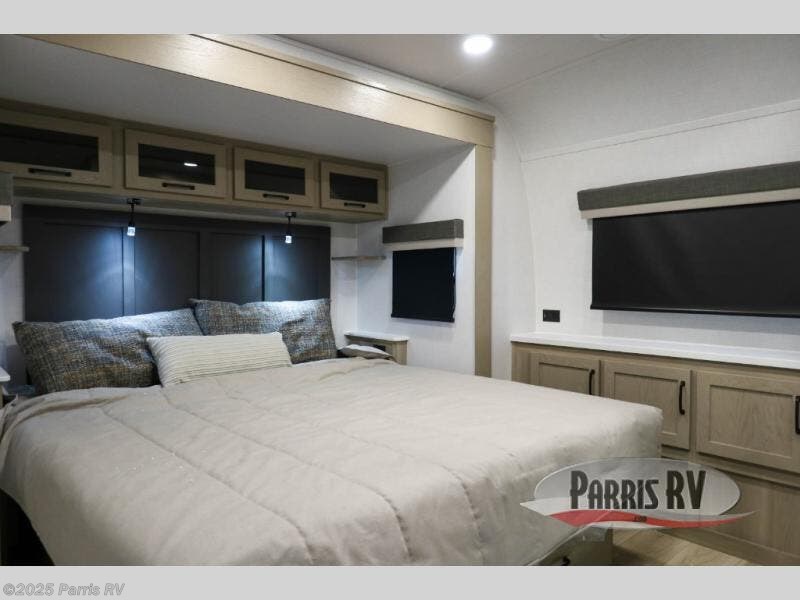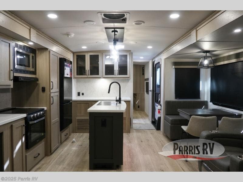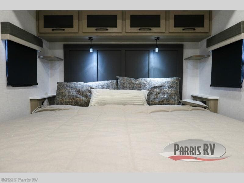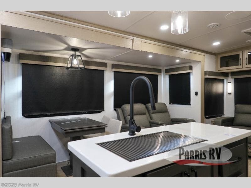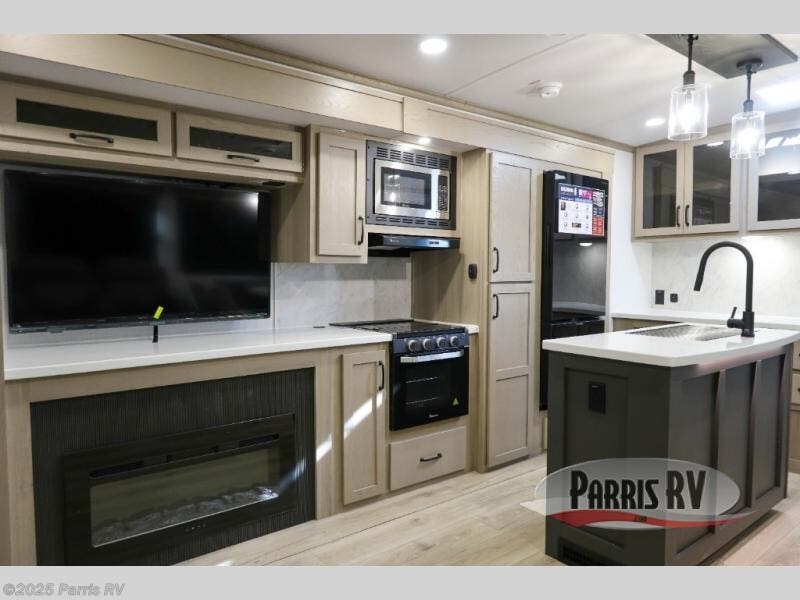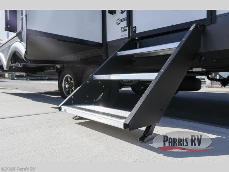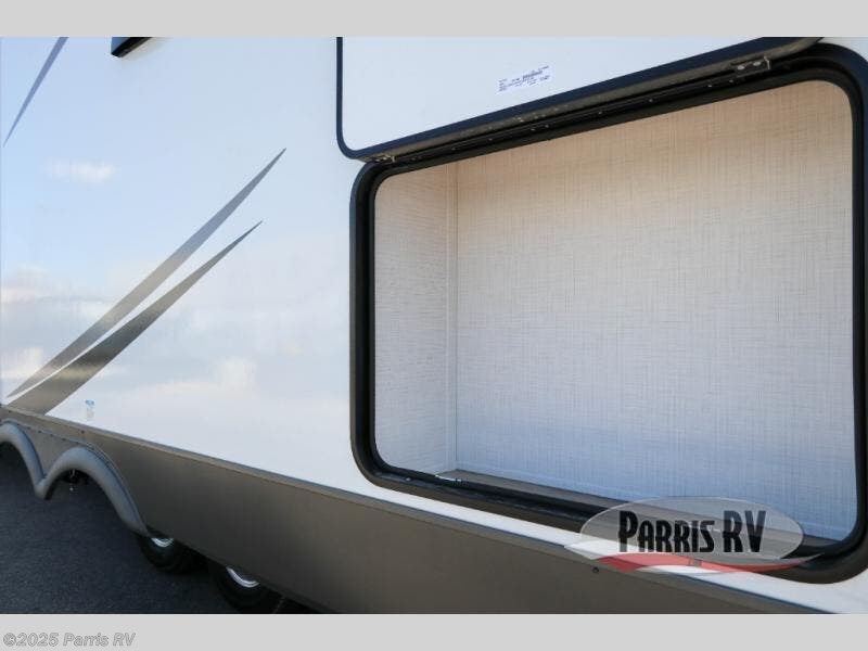 You're going to love the amount of natural light in this model with large windows in the back and the door side. The chef of the group will love the kitchen island, and there is tons of storage space for dishes, food, and knickknacks. The entertainment center with a Smart TV will allow you to watch movies at night, or you may just find yourselves outside under the two power awnings with LED lights. There is also an outside griddle here to cook pancakes in the morning. The king bed is sure to bring comfort, and you'll appreciate the large wardrobe to keep your clothes tidy. There is even washer and dryer prep if you choose to go full-time!