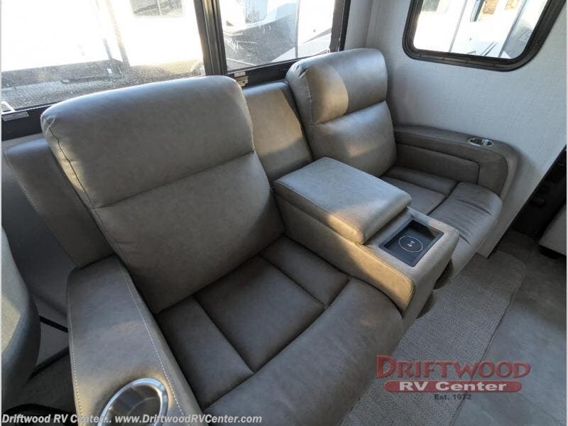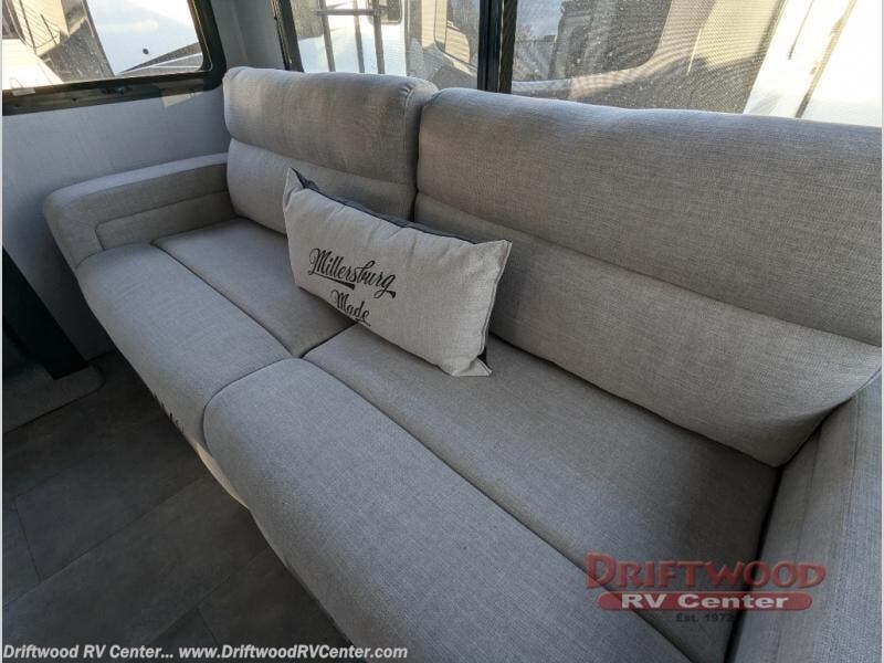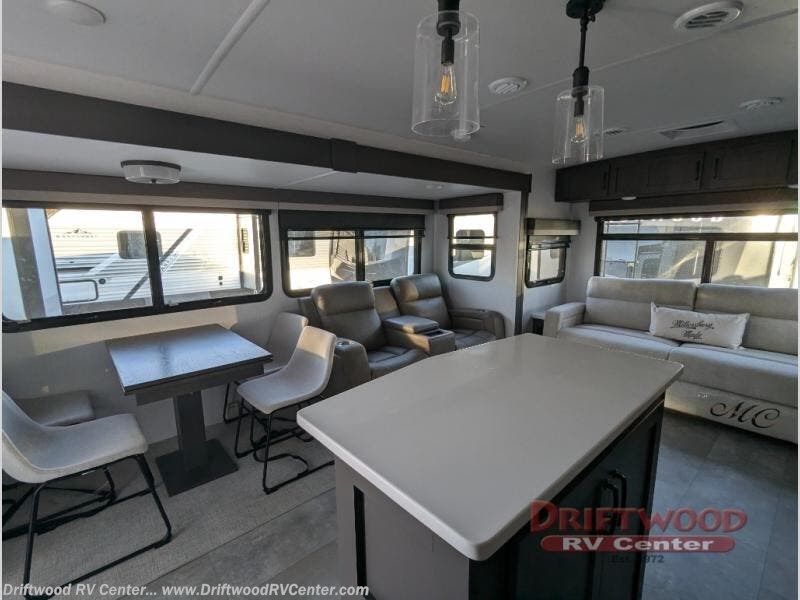 This trailer allows you to seat nine people, and the kitchen island provides a great place for the snacks and beverages. The dual opposing slides give the main living and kitchen area lots of floor space for everyone to move around, and the double entry bath is convenient with access from the hallway and the master suite. The front bedroom offers a queen bed slide, a wardrobe and storage along the front wall, plus you can choose to add an optional TV. And the two 11' power awnings give you an outdoor living area protected from the elements; just add your camping chairs.