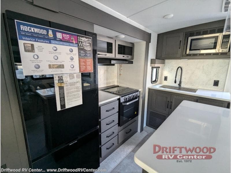 Each Rockwood Ultra Lite travel trailer by Forest River includes superior construction with a high gloss front cap, laminated white fiberglass sidewalls, and tinted frameless windows for a sleek look. The torsion axle, Rubber-Ryde suspension will make towing smooth and hassle-free, along with the nitrogen filled, Goodyear Endurance tires and the tire pressure monitor system. Interior comforts include designer kitchen backsplash, solid wood cabinet doors with hidden hinges, and night roller shades to name a few. Choose a Rockwood Ultra Lite travel trailer today!