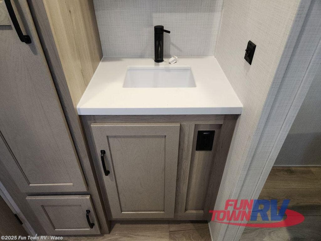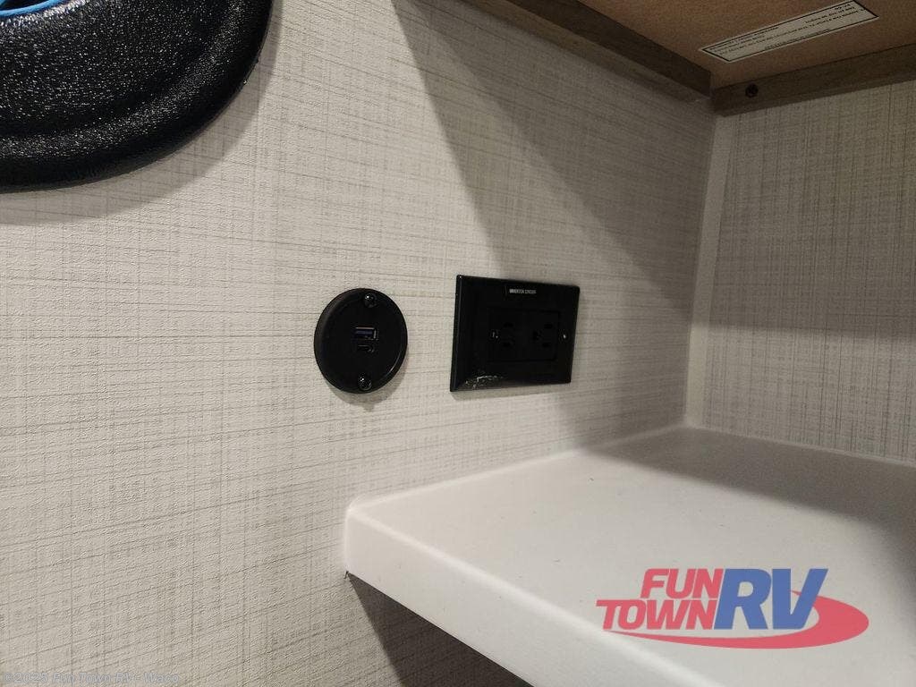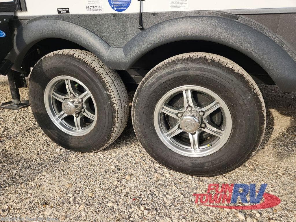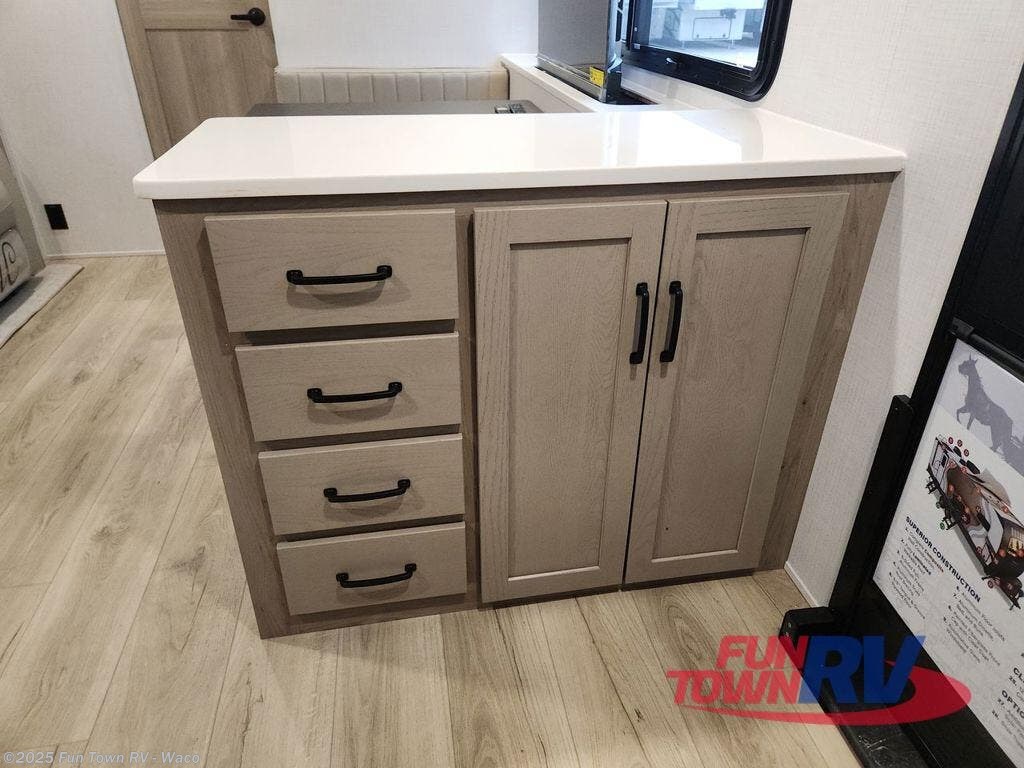 If you've been searching for a full-featured travel trailer, this is the one! Not only will you enjoy your own space up front in the master bedroom, but your guests can claim the rear bunkhouse suite all to themselves. There are two bunks with storage here, along with a desk, and a half bath for convenience. Your crew can meet in the middle living area on the theater seat or booth dinette. There is also a 39" TV here for movie nights! The chef can choose to cook indoors on the three burner range, or head outdoors to use the exterior griddle. A full walk-thru bath is sure to come in handy after a day at the lake, and did we mention this unit has dual entry doors?!