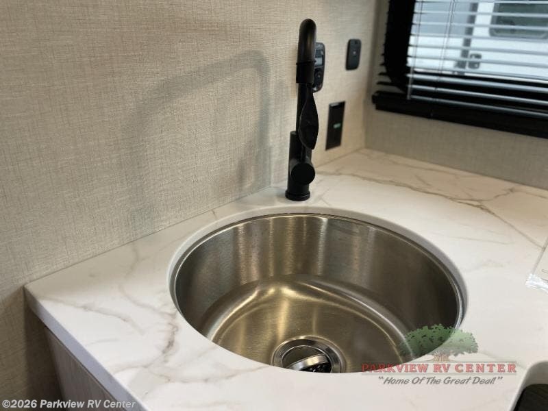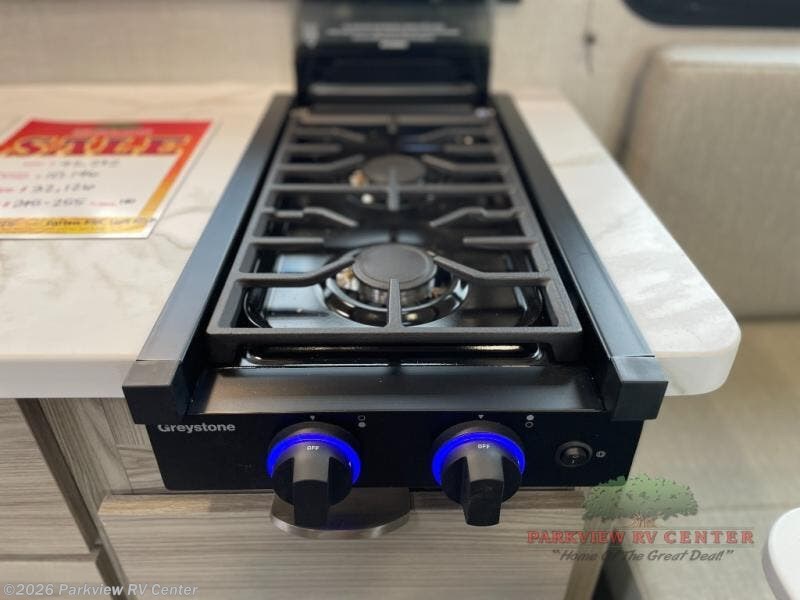 This travel trailer is perfect for couples who want to explore the great outdoors together! There is a rear private bedroom with a queen bed slide for more interior space, a dresser and wardrobes on either side of it for your clothes. Plus, it enters right into the split style bathroom which will come in handy when one person wants to freshen up in the shower while another uses the private toilet and sink. You can prepare your best home cooked meals with the two burner cooktop then enjoy it at the front U-shaped dinette which can also transform into an extra sleeping space. Enjoy making pancakes on the outdoor kitchen under the 15' power awning!