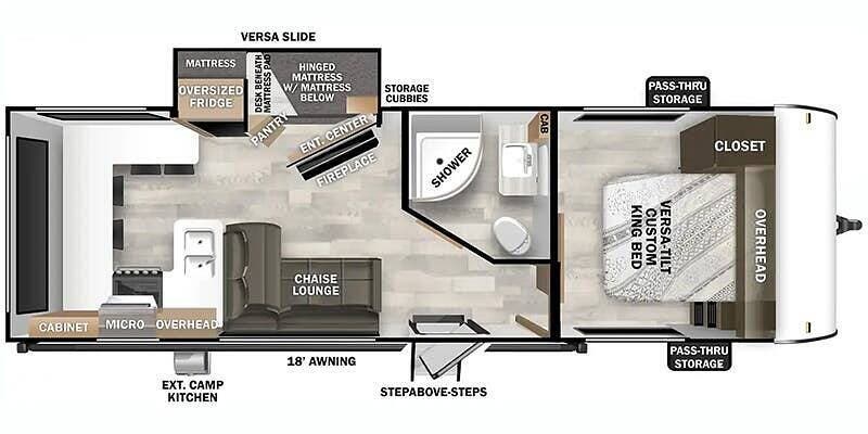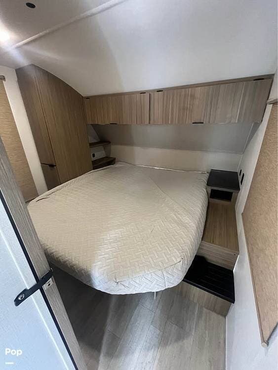At the very front is the bedroom with a king bed, closets, and overhead storage.
