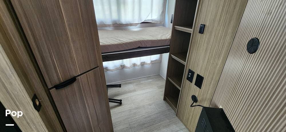 On the right side, in the slideout, is the Versa-Slide. This space has storage, two bunks, and a fold-out desk that can double as a small office area.