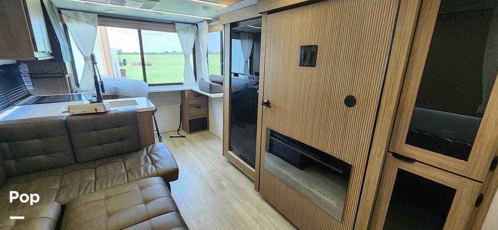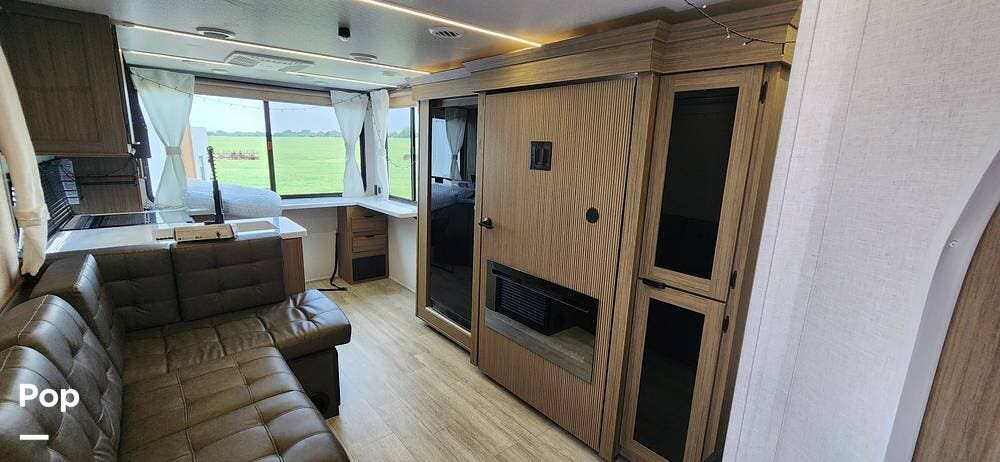 You step in through the side entry door, located near the middle. Straight ahead is the living area, featuring a sofa that faces the entertainment center and fireplace.