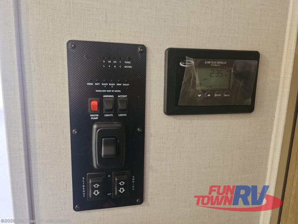 The perfect couple's coach with a view! This Salem View features a kitchen island and four bar stools for dining and prep space. A sectional sofa across the back of the unit provides ample seating to relax and enjoy a good book or the entertainment center. Behind the entertainment center, you will find hidden storage space with shelves so everything can be tucked out of sight, and an oversized refrigerator will provide enough space for your perishables while you are on vacation as well. A full bath is conveniently located near the main entry featuring StepAbove entry steps. The bath provides a walk-in shower, vanity with sink, toilet, and linen storage. In the private front bedroom, a Versa-Tilt custom king bed will allow you a relaxing and comfortable night's rest, and once again, a great view out the dual opposing windows. On the outside, an awning offers additional living space protected from the elements, and a spacious pass-through storage compartment will allow you to stow away your camp chairs and outdoor equipment and games easily for transport.