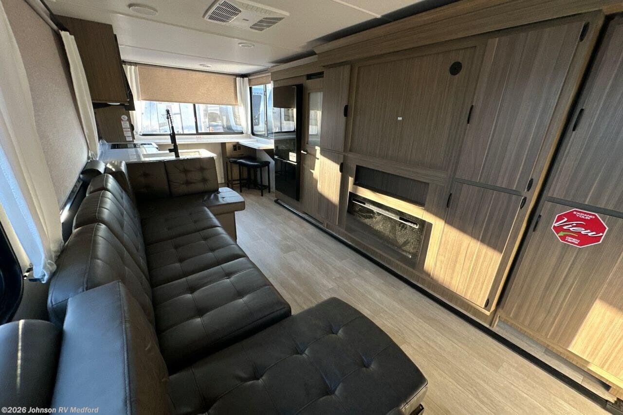 The 2025 Forest River Salem 29VIEW is a travel trailer that redefines open-concept living on the road. Measuring approximately 34 feet 10 inches in length and weighing around 8,001 lbs (dry weight), it's designed for families and travelers who desire a spacious yet manageable RV experience. Inside, the 29VIEW features a front private bedroom with a Versa-Tilt custom king bed, providing additional floor space and comfort. The innovative Versa Slide includes a set of 30" x 70" bunks with a flip-up top bunk, storage cubbies, and a desk with a bar stool, making it perfect for work or study on the go. The rear kitchen is a chef's dream, boasting 18 linear feet of solid surface countertops, a three-burner range, double sink, and a full-size refrigerator, ensuring meal preparation is convenient. The living area includes a sectional sofa facing a shiplap entertainment center with a fireplace, creating a cozy atmosphere for relaxation.