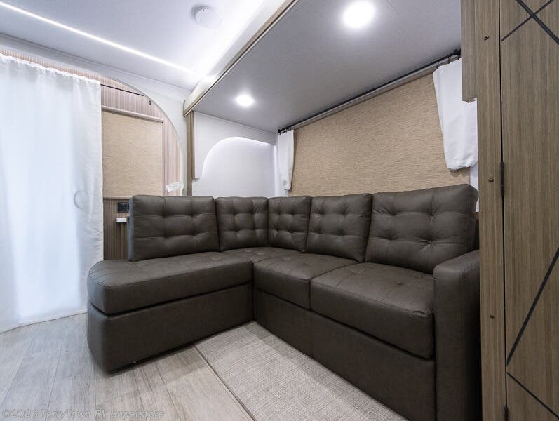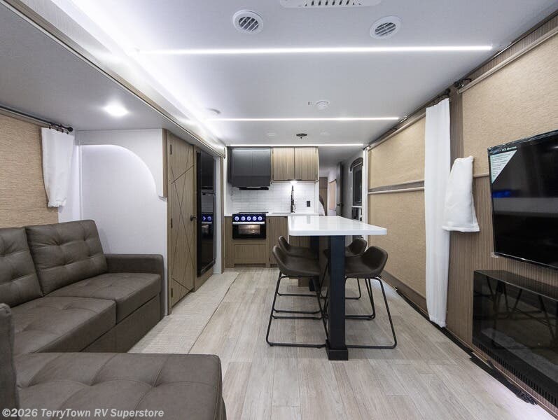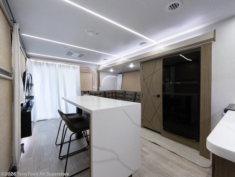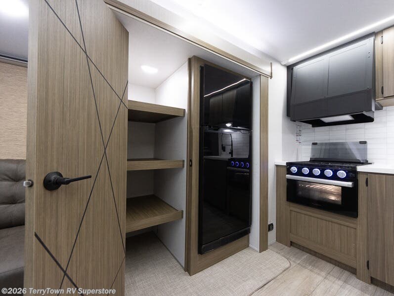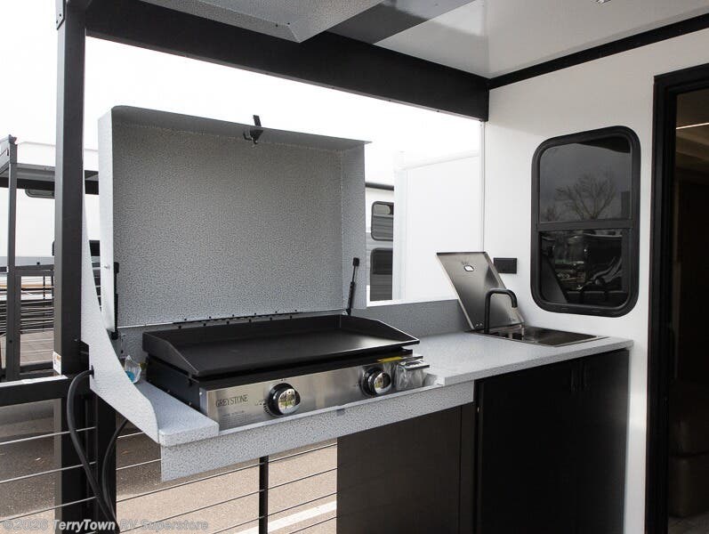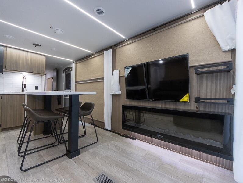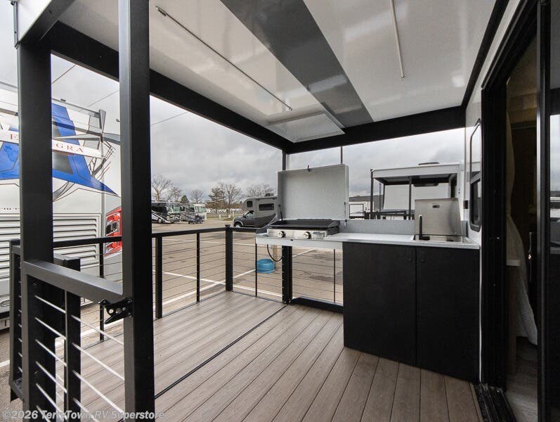 This travel trailer will feel more like home with its rear veranda/porch, dual entry doors, and front private bedroom! There is an outdoor kitchen on the back porch so you can make lunch in the fresh air, and the patio doors lead right into the main living area. Your crew can relax on the L-shaped sofa across from the fireplace, which will make your space more cozy. A kitchen island with four chairs will provide a place to dine at, and there is a spacious pantry and refrigerator for food storage. You will love having your own space in the private bedroom, and the Versa-Tilt custom king bed will let you sit up in bed to read your book at night.