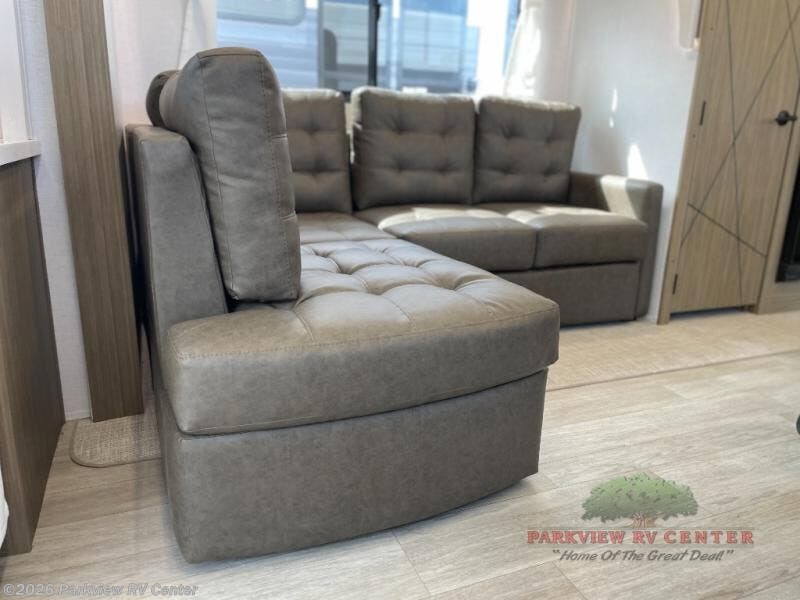This travel trailer will feel more like home with its rear veranda/porch, dual entry doors, and front private bedroom! There is an outdoor kitchen on the back porch so you can make lunch in the fresh air, and the patio doors lead right into the main living area. Your crew can relax on the L-shaped sofa across from the fireplace, which will make your space more cozy. A kitchen island with four chairs will provide a place to dine at, and there is a spacious pantry and refrigerator for food storage. You will love having your own space in the private bedroom, and the Versa-Tilt custom king bed will let you sit up in bed to read your book at night.