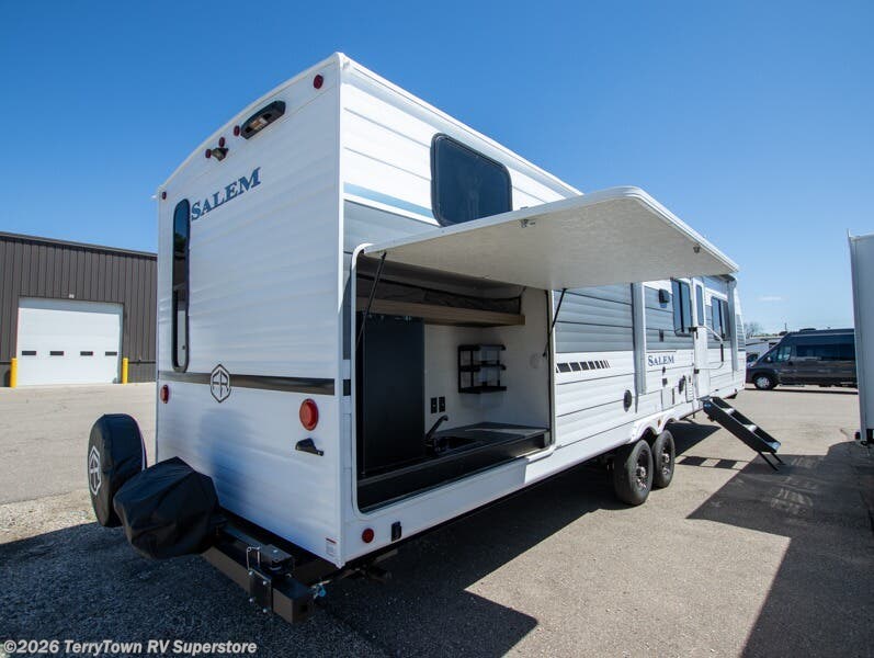 Do you need a break from the mundane camping life? If so, it's time to check out this exciting and full-featured Salem travel trailer! This unit provides two separated sleeping spaces; a rear private bunkhouse and a front private bedroom. Another feature that is just as helpful as the one in your own home is the kitchen. With an oversized refrigerator, cooktop, double sink, and abundant cabinet storage, you will be able to create delicious meals for the entire family. Plus, if you prefer to have a sunrise breakfast, you can simply take your preparations outside to the outdoor kitchen!