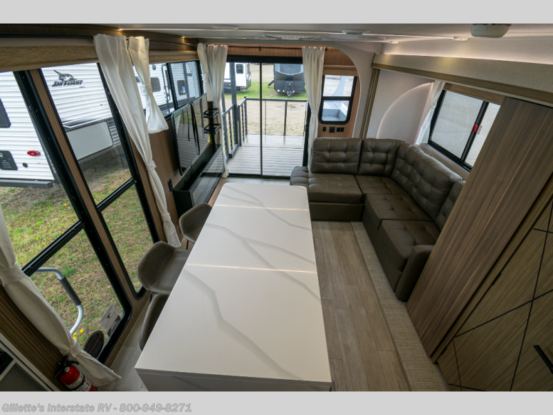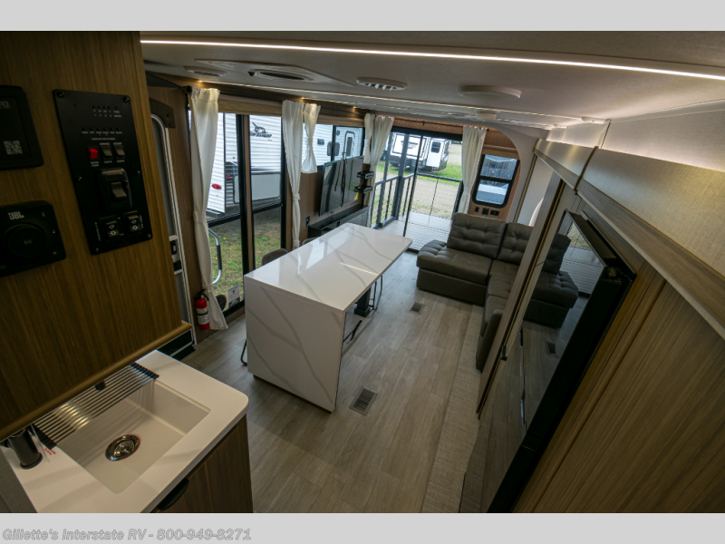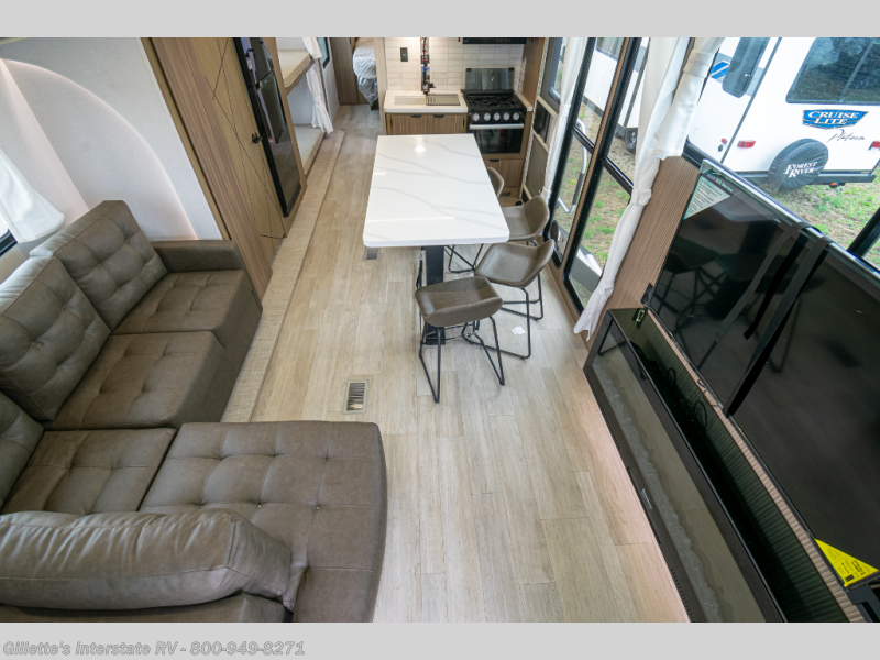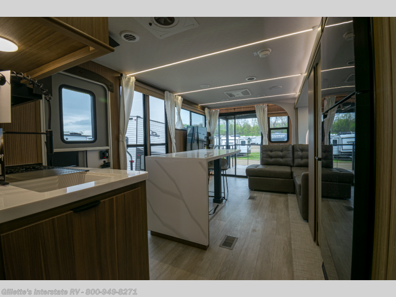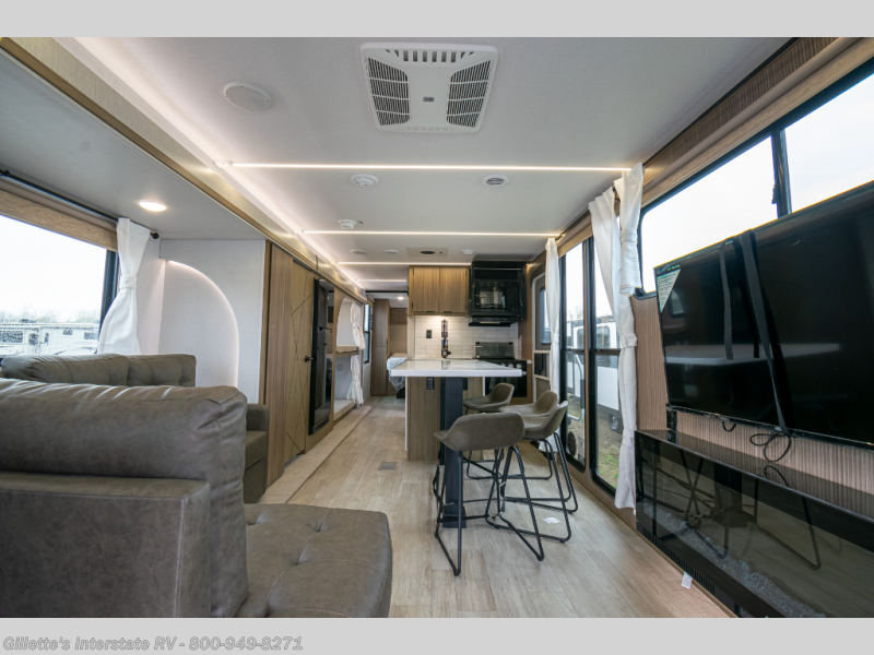 Spacious Interior: At 39 feet in length with a single slide-out, this model offers ample living space, including an L-shaped sofa, a fireplace, and a kitchen island with four chairs.