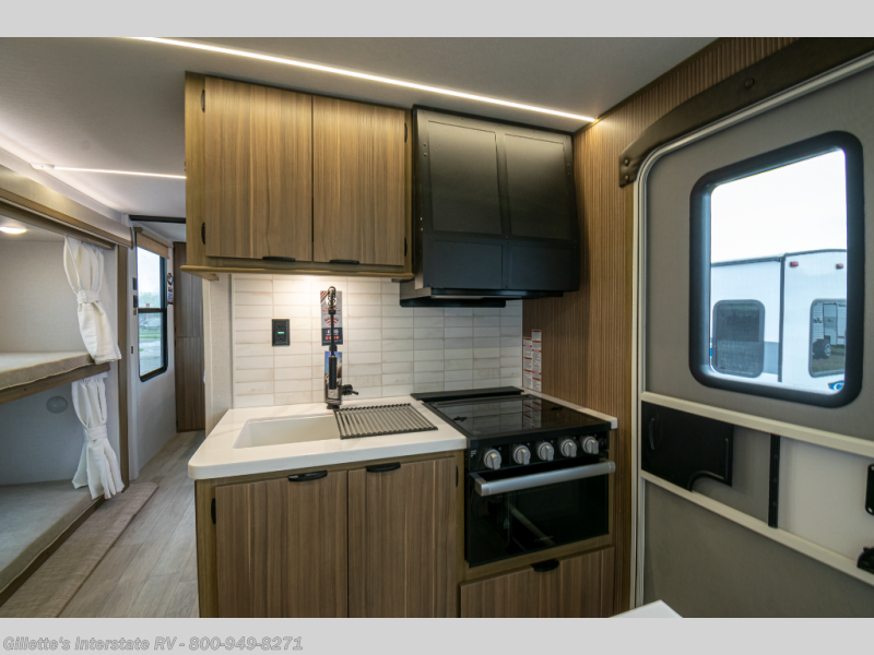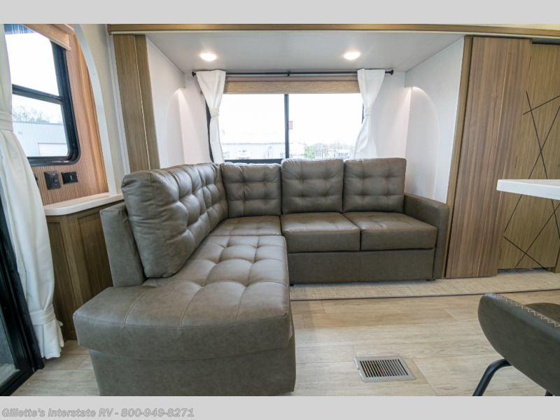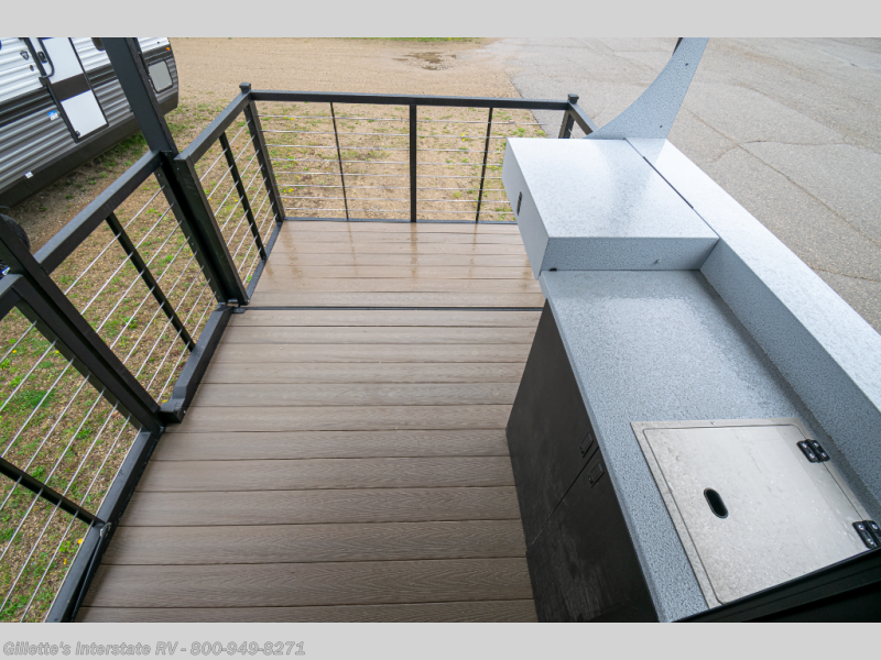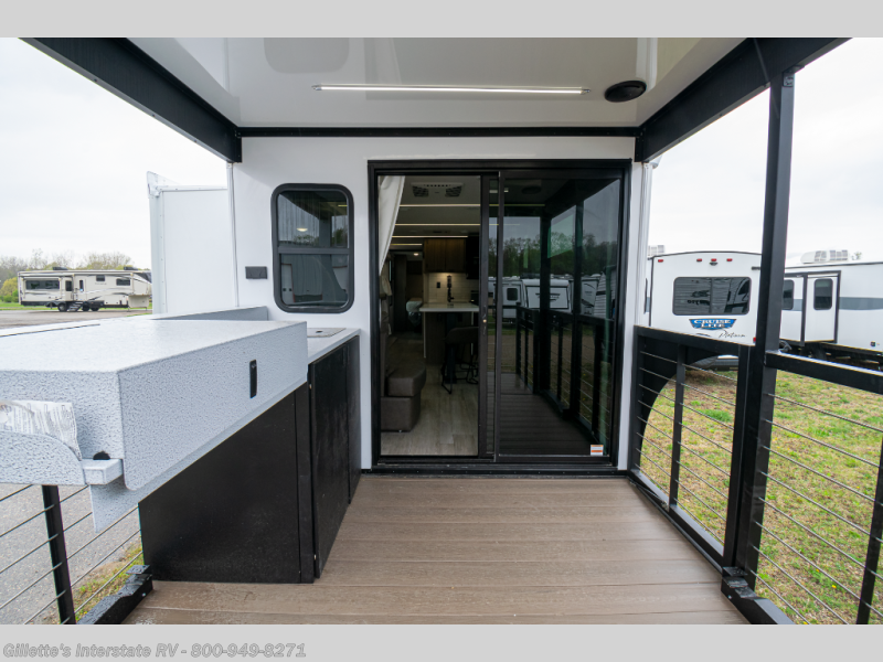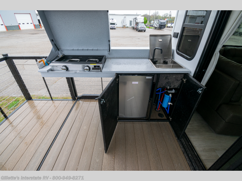 This travel trailer will feel more like home with its rear veranda/porch, dual entry doors, and front private bedroom! There is an outdoor kitchen on the back porch so you can make lunch in the fresh air, and the patio doors lead right into the main living area. Your crew can relax on the L-shaped sofa across from the fireplace, which will make your space more cozy. You will love having your own space in the private bedroom, and the Versa-Tilt custom king bed will let you sit up in bed to read your book at night, while your guests take the bunk beds within the large slide out!