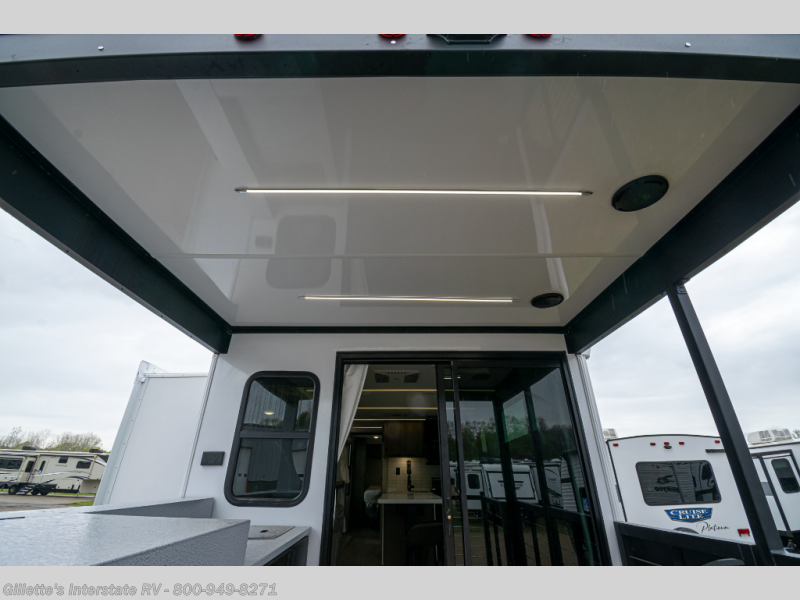 Modern Amenities: Features a 20-foot awning with LED lighting, a 13,500 BTU air conditioner, and an on-demand tankless water heater for added comfort.