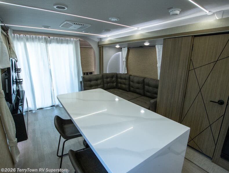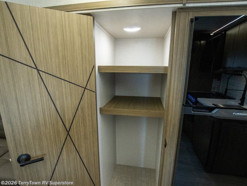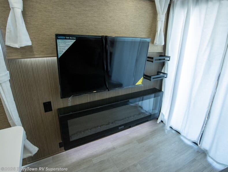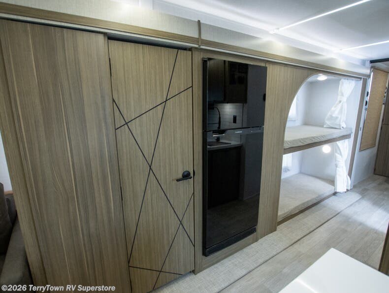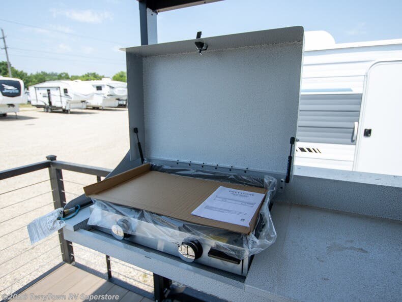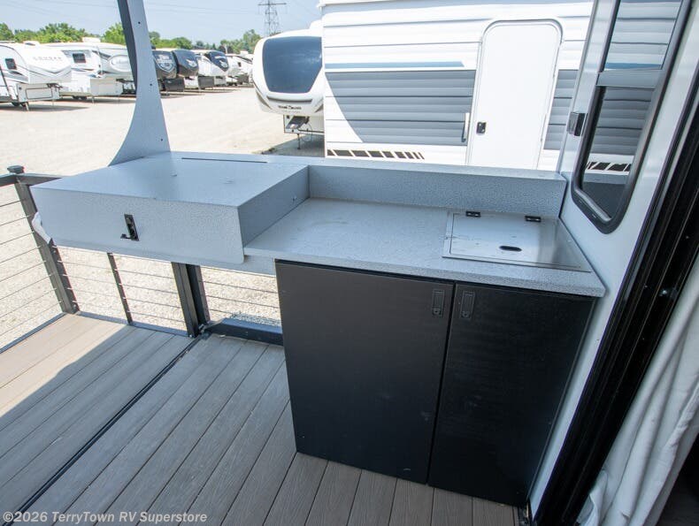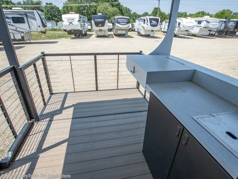 This travel trailer will feel more like home with its rear veranda/porch, dual entry doors, and front private bedroom! There is an outdoor kitchen on the back porch so you can make lunch in the fresh air, and the patio doors lead right into the main living area. Your crew can relax on the L-shaped sofa across from the fireplace, which will make your space more cozy. You will love having your own space in the private bedroom, and the Versa-Tilt custom king bed will let you sit up in bed to read your book at night, while your guests take the bunk beds within the large slide out!