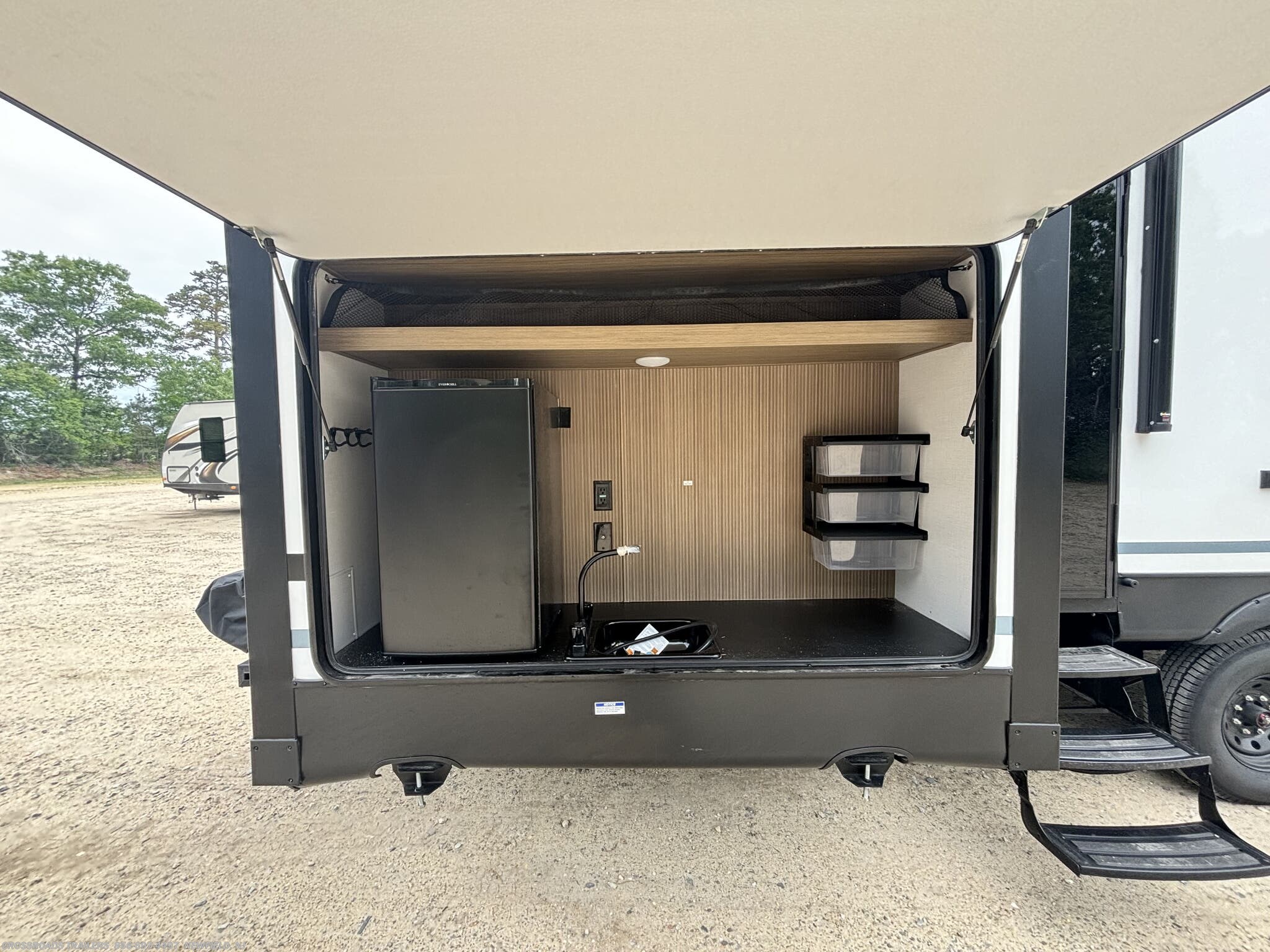 - Additional outdoor amenities include an awning, external shower, and leveling jacks for quick setup