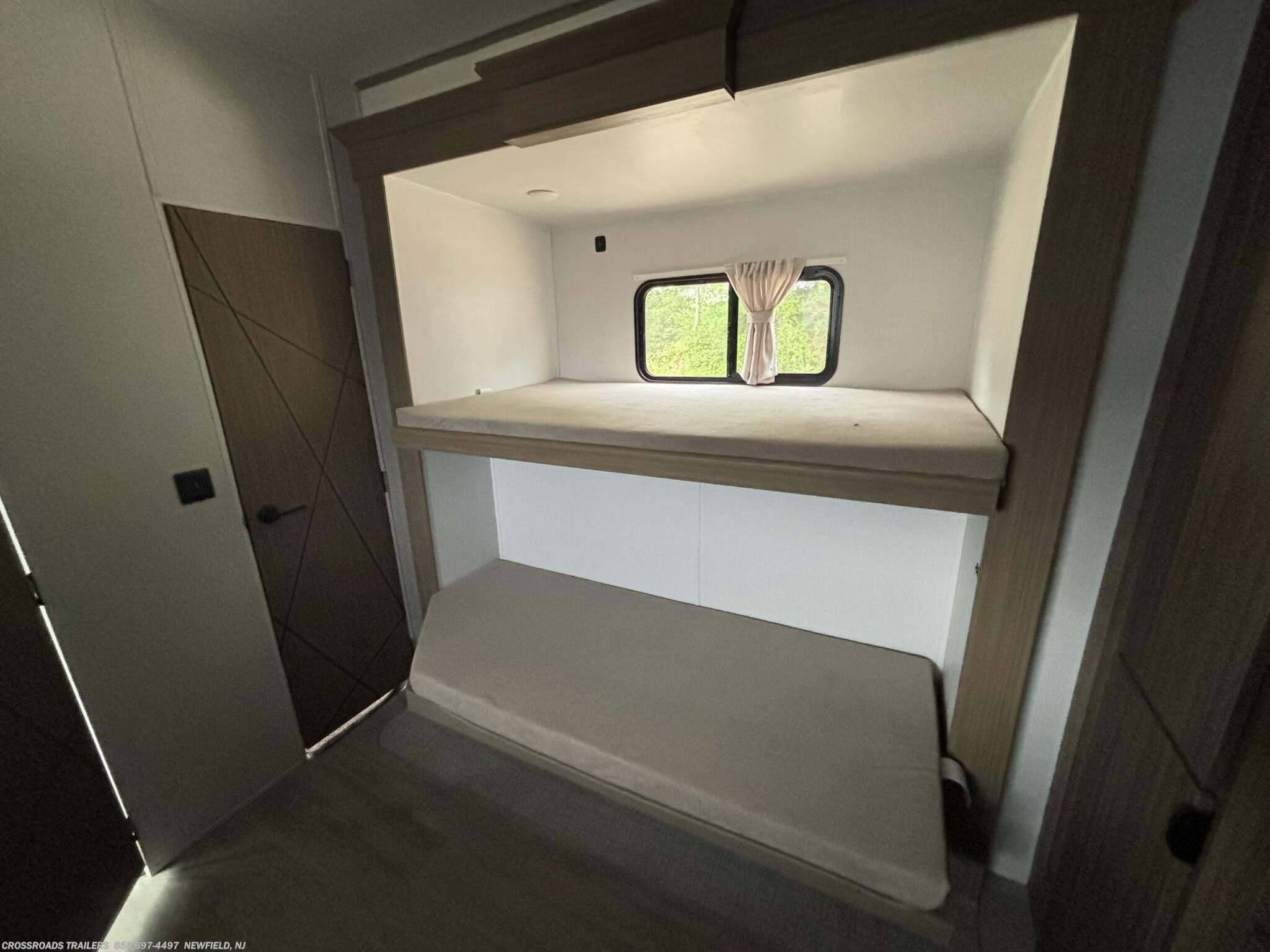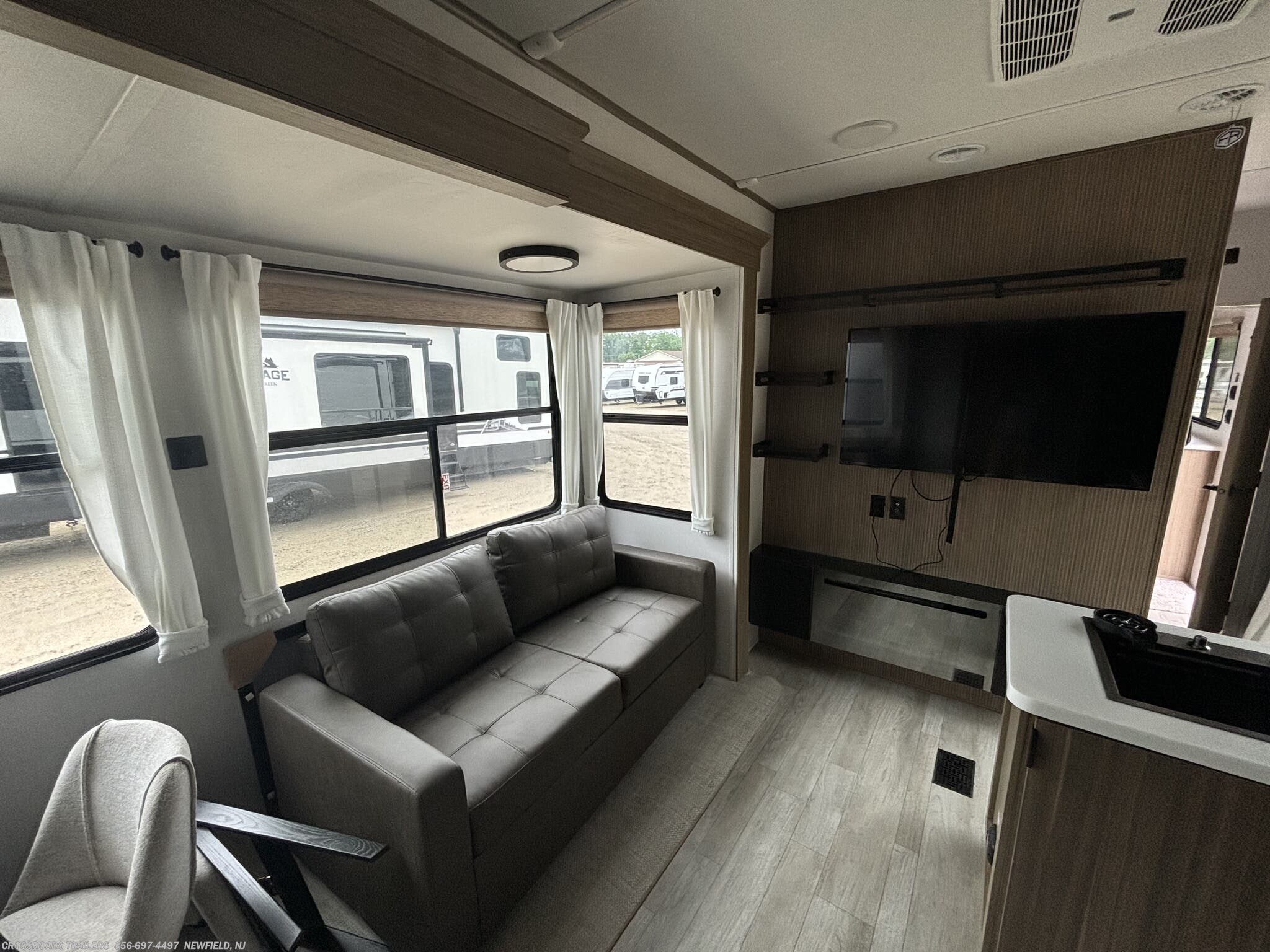Measuring approximately 42 feet 4 inches in length and 8 feet wide, this travel trailer is engineered to maximize living space. It comfortably sleeps up to 11 people, making it perfect for family vacations or large group outings. The floor plan features a cozy queen bed, bunk beds, and other sleeping areas, ensuring a restful night for everyone. Four slide-outs expand the interior, creating an open and inviting atmosphere that feels like a home away from home, whether parked at a campsite or in remote outdoor settings.
