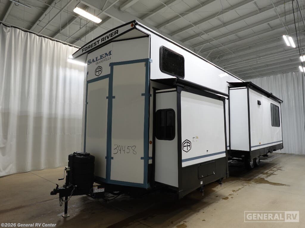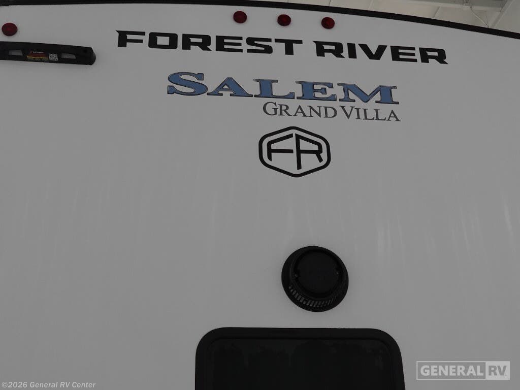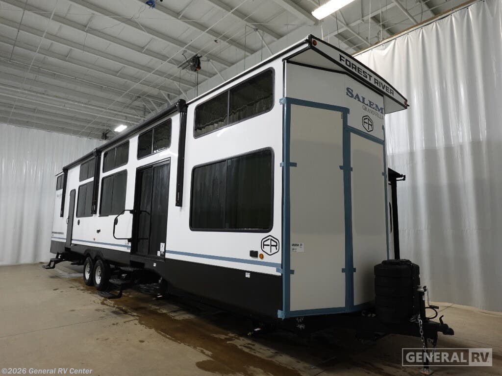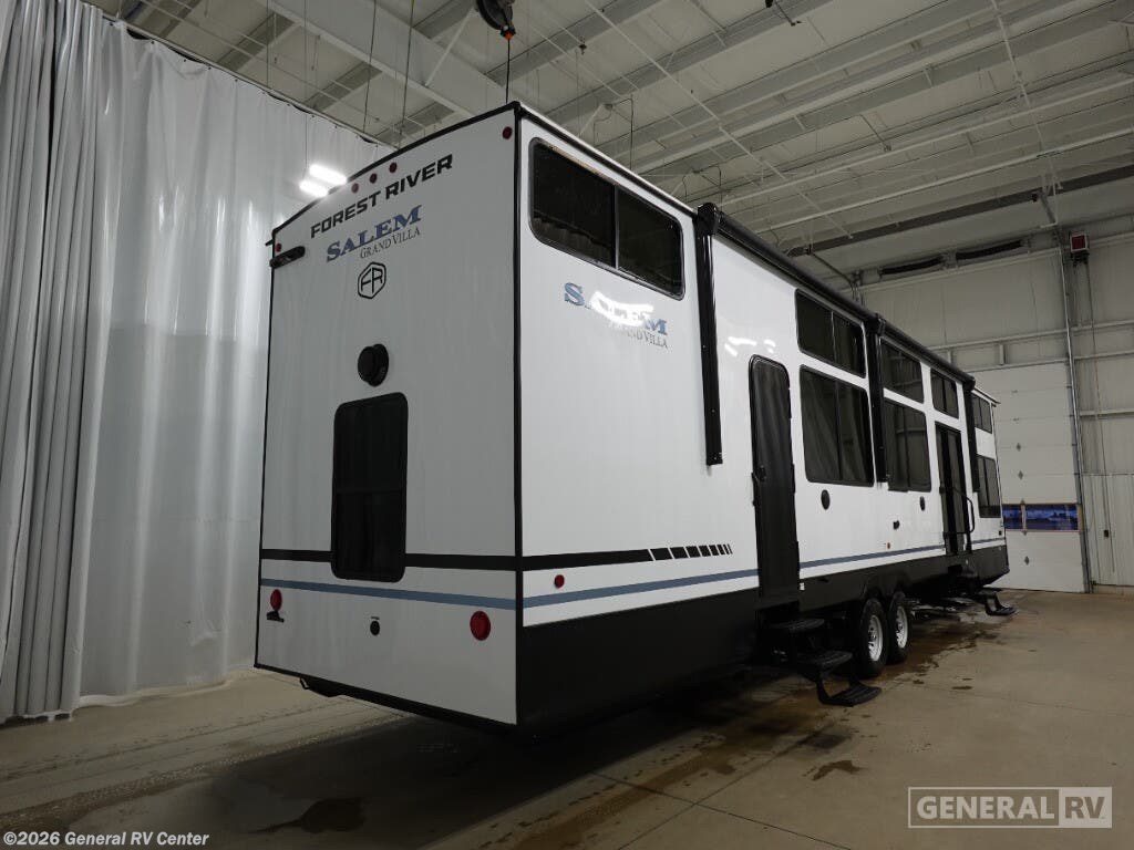 ## Forest River Salem Grand Villa destination trailer 42VIEW highlights - Two Lofts - Kitchen Island - King Bed with Versa-Tilt - Fireplace - Dual Entry Doors You will feel right at home in this destination trailer! It has not only has one loft in the rear with two 42" x 74" bunk mats, but also a second loft in the front with spiral steps leading up to two bunk mats. The front private bedroom features a king bed slide with versa-tilt to lay your head on at night with front windows to let in lots of natural lighting and sunshine in the morning. Relax in true comfort at night on the L-shaped sectional sofa across from the entertainment center with a fireplace. The kitchen island provides extra space to prepare delicious meals and comes with four bar stools to enjoy your breakfast each morning. Everyone will stay fresh and clean with a walk-in shower in the rear private bedroom, plus there is an area with a washer and dryer. Head outside through either the patio door or the second entry/exit door each day! You will experience a home away from home with any one of these Forest River Salem Grand Villa destination trailers! Their construction consists of a 12" forged I-beam frame, a cambered chassis, and plywood floor decking, as well as 5" bowed truss roof rafters, 3/8" roof decking, and color coded water lines to make life easier. The one-piece, seamless slides and 106" interior living room height makes for more walking around space. A Best in Class Value package includes upgraded designer furniture, a central vacuum with sweep attachment, and stainless steel kitchen appliances. Plus, it features a heated and enclosed Accessi-Belly with removable panels and an exterior LED light strip under the awning. Come choose your favorite model today!