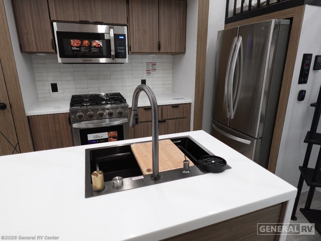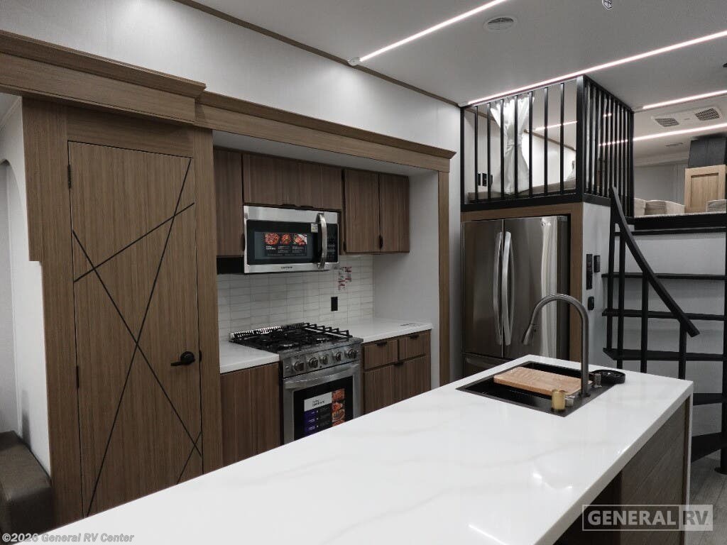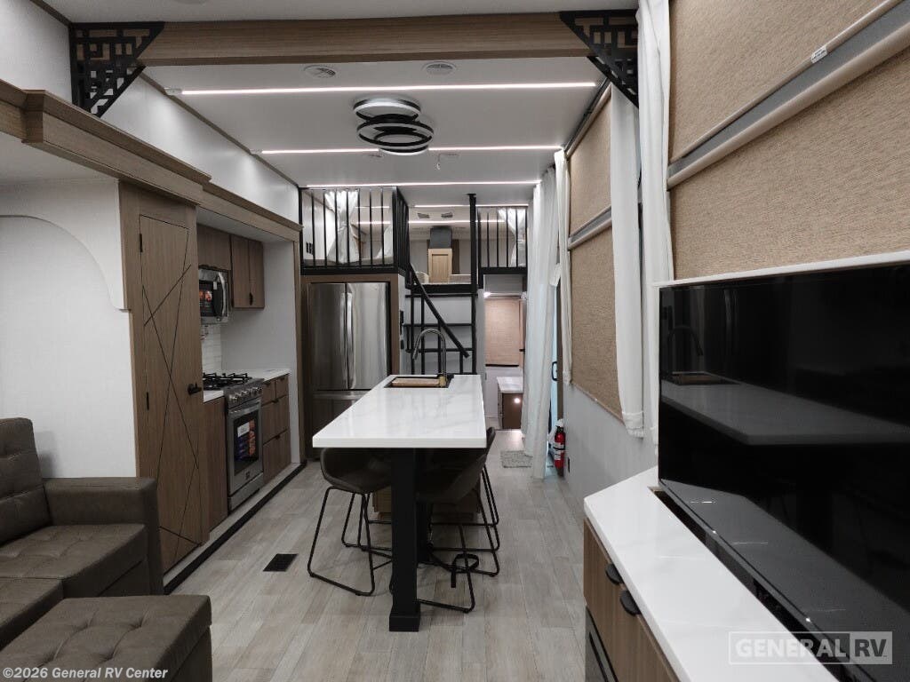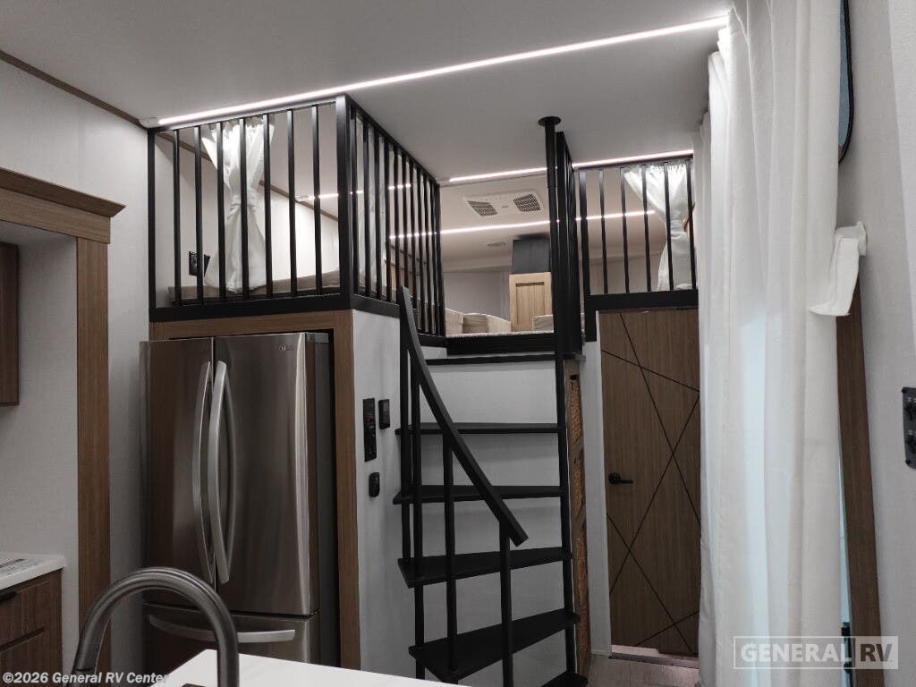 ## Forest River Salem Grand Villa destination trailer 42VIEW highlights - Two Lofts - Kitchen Island - King Bed with Versa-Tilt - Fireplace - Dual Entry Doors You will feel right at home in this destination trailer! It has not only has one loft in the rear with two 42" x 74" bunk mats, but also a second loft in the front with spiral steps leading up to two bunk mats. The front private bedroom features a king bed slide with versa-tilt to lay your head on at night with front windows to let in lots of natural lighting and sunshine in the morning. Relax in true comfort at night on the L-shaped sectional sofa across from the entertainment center with a fireplace. The kitchen island provides extra space to prepare delicious meals and comes with four bar stools to enjoy your breakfast each morning. Everyone will stay fresh and clean with a walk-in shower in the rear private bedroom, plus there is an area with a washer and dryer. Head outside through either the patio door or the second entry/exit door each day! You will experience a home away from home with any one of these Forest River Salem Grand Villa destination trailers! Their construction consists of a 12" forged I-beam frame, a cambered chassis, and plywood floor decking, as well as 5" bowed truss roof rafters, 3/8" roof decking, and color coded water lines to make life easier. The one-piece, seamless slides and 106" interior living room height makes for more walking around space. A Best in Class Value package includes upgraded designer furniture, a central vacuum with sweep attachment, and stainless steel kitchen appliances. Plus, it features a heated and enclosed Accessi-Belly with removable panels and an exterior LED light strip under the awning. Come choose your favorite model today!