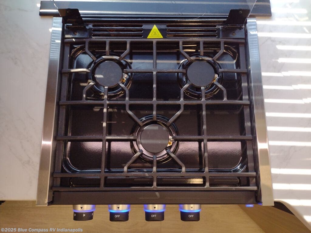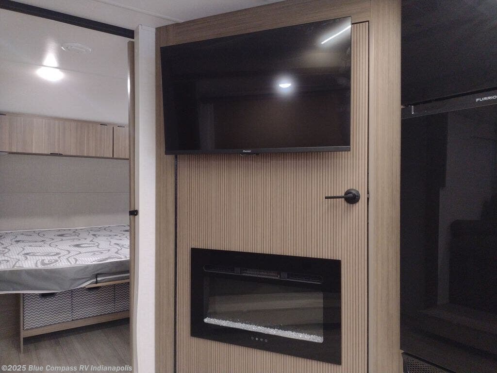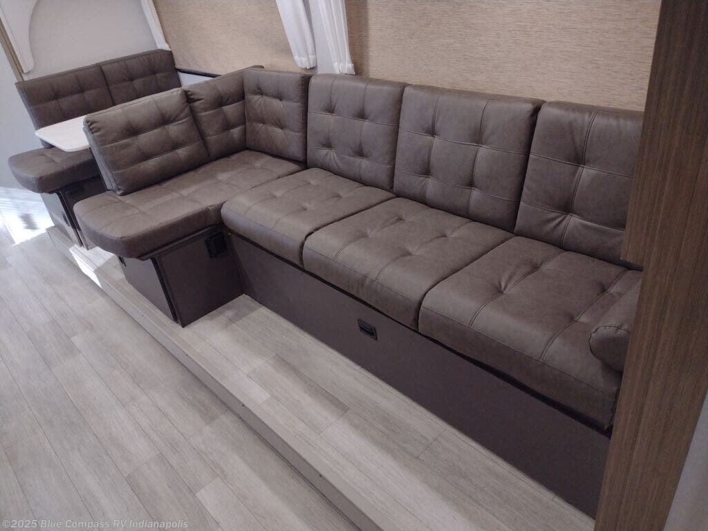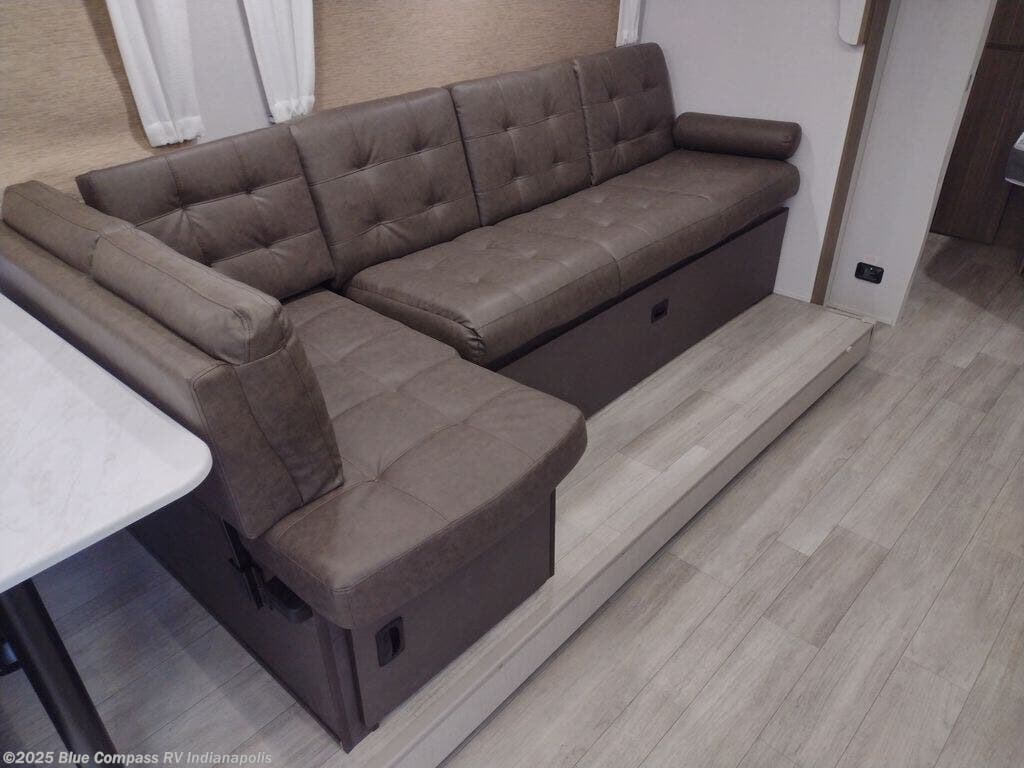 You're sure to make camping memories in this spacious travel trailer! You can easily sleep eight people each night thanks to the double-size bunks, the custom king bed with Versa Tilt in the front bedroom plus the Versa-Lounge within the large slide out! The cooktop and microwave oven will let you make meals each day, and you'll appreciate the hidden pantry with shelves behind the fireplace. There is also a booth dinette where you can dine together or play a game of cards after dinner is cleaned up, or you may just find yourselves outdoors under the 18' awning with 4K blade lighting. And don't overlook the full bath, complete with a tub/shower that will make bath time easier if you have little ones.