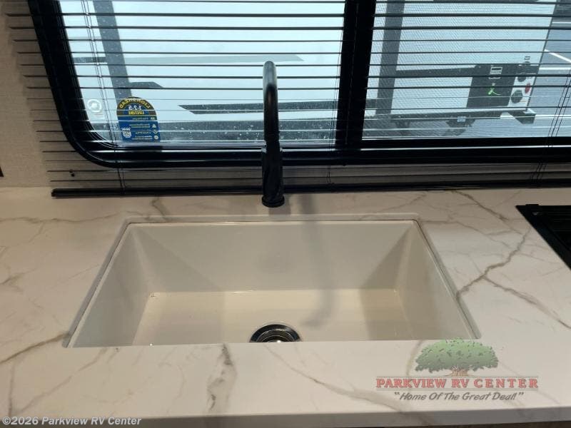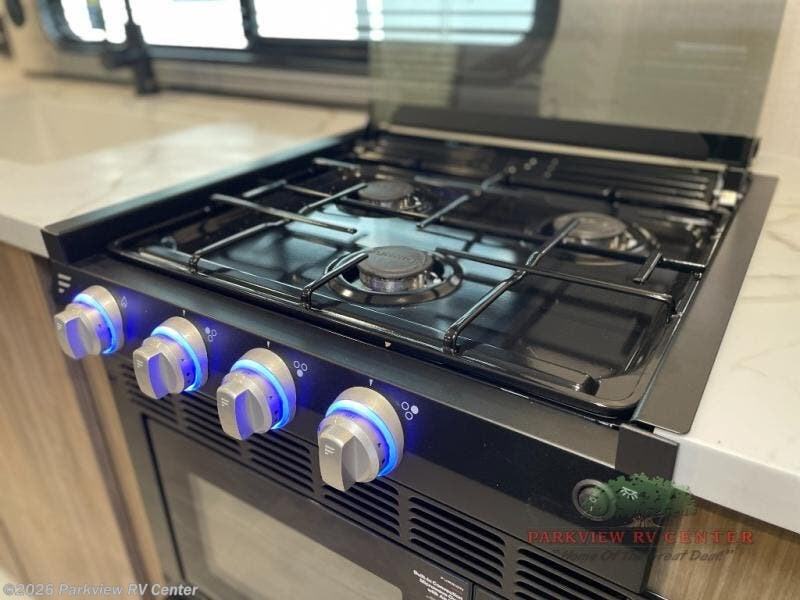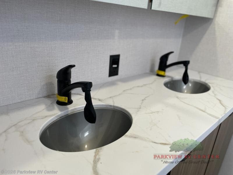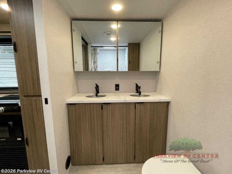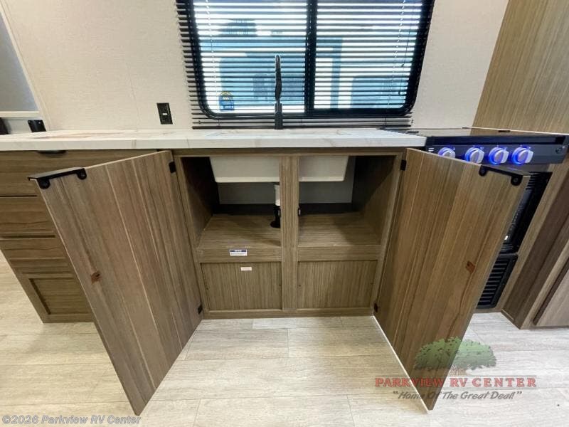 Camping is made easy in this travel trailer with at-home comforts! You'll have the front private bedroom with a king bed all to yourselves, and there are dual bedroom wardrobes to keep your space neat and clean. Any additional guests can sleep on the super lounge with a removable table. You will appreciate the full rear bath complete with a linen closet and dual bath sinks so you both can get ready for bed at once. And a full kitchen lets you whip up your best meals!