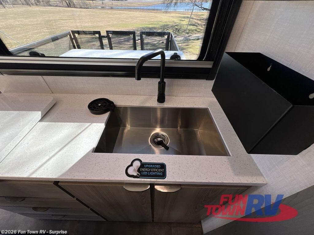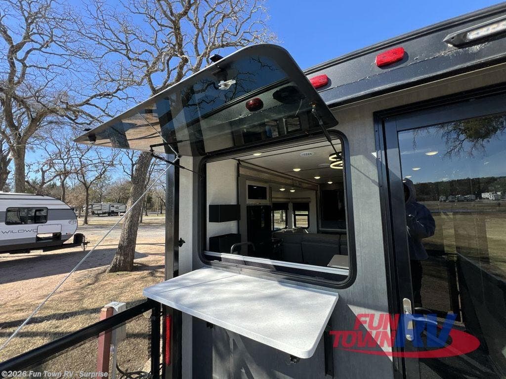 This toy hauler is one to remember! There is a ramp door to easily load in gear, a large slide out for more interior space, plus a front private bedroom just like at home. Your crew can relax on the super lounge across from the entertainment center or head outdoors to visit under the awning. The chef of your group will love cooking in the kitchen with ample counter space, including a bar top with two stools.