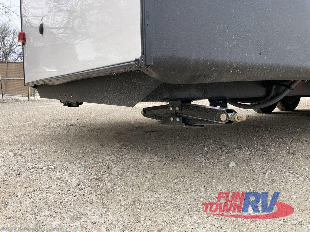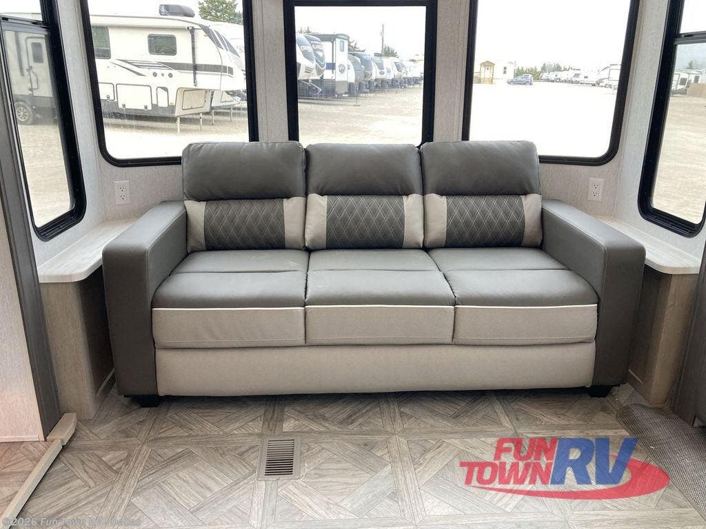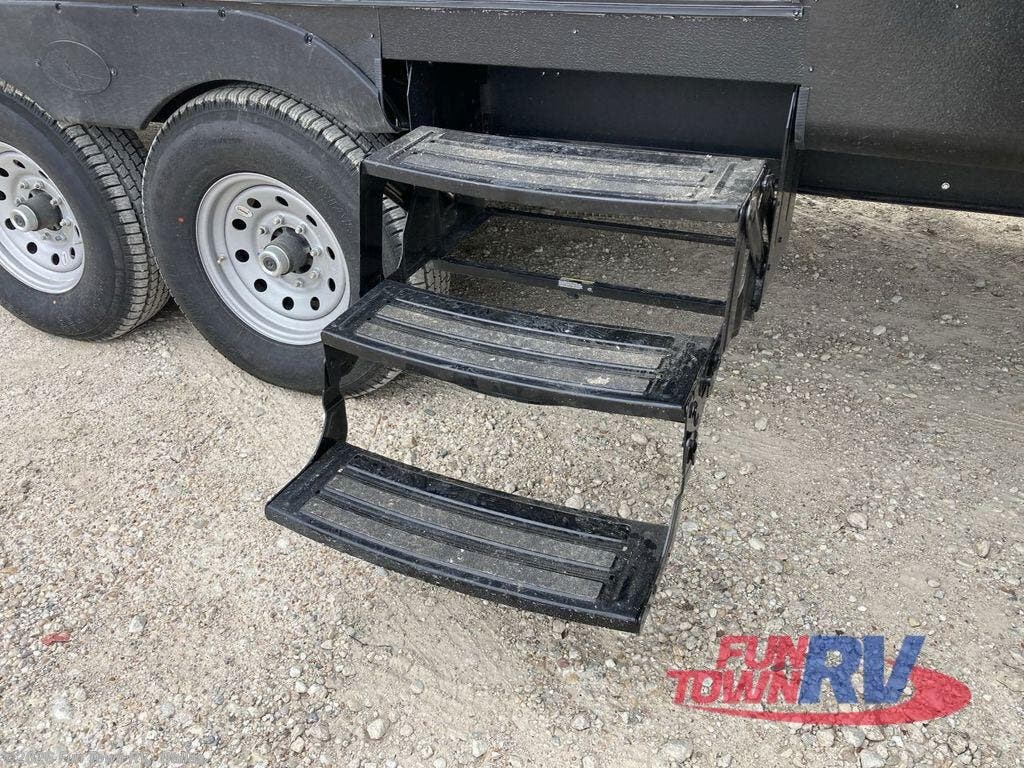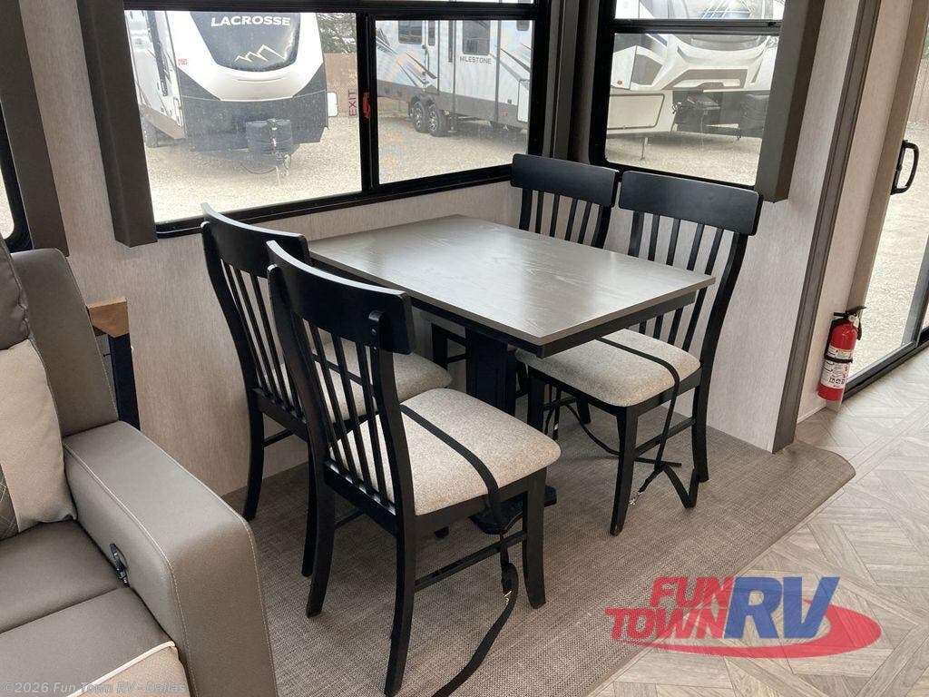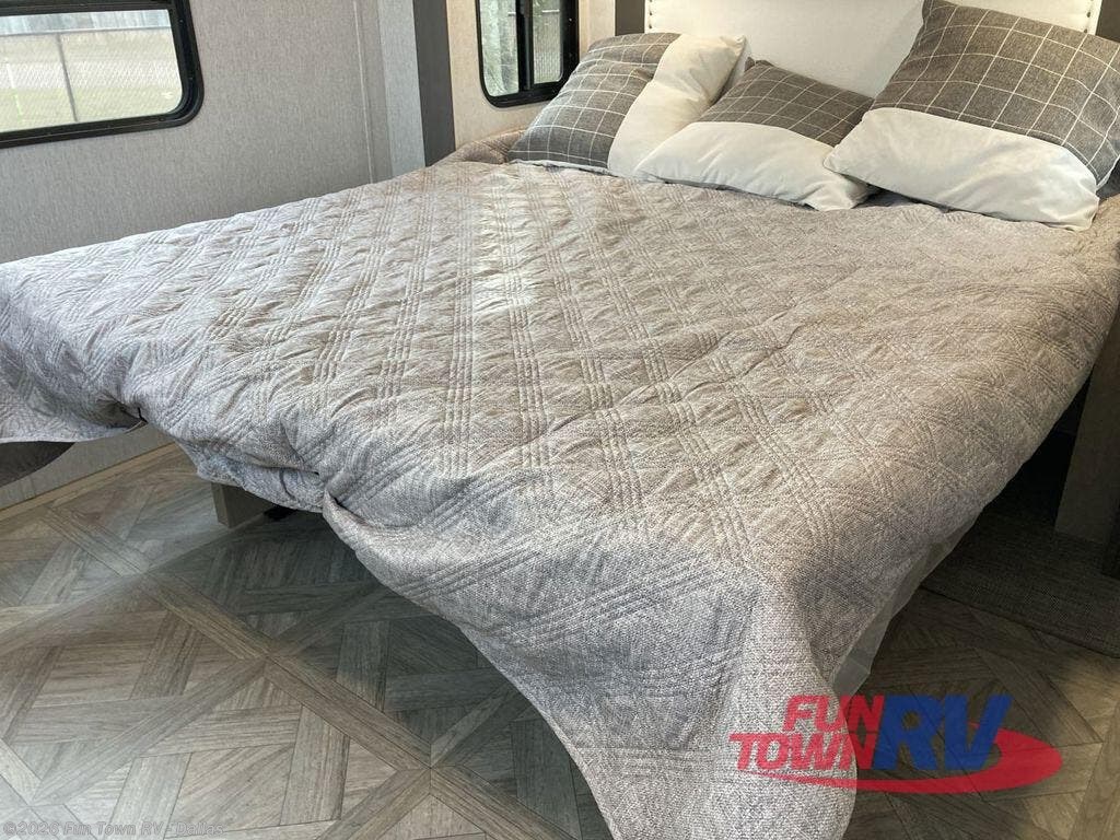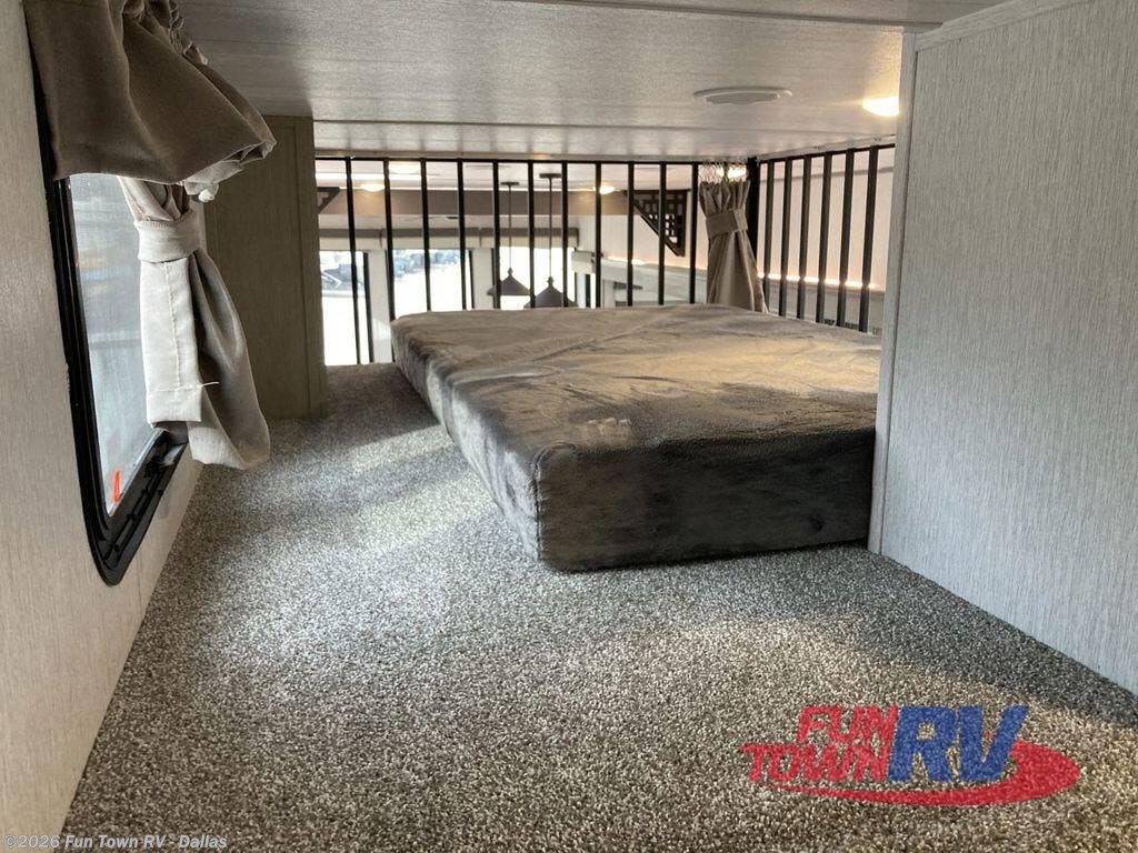 The grandkids will be begging to come along with you on your next getaway in this destination trailer! It features a double loft with three 42" x 74" bunk mats in total above the rear private bedroom. Inside the bedroom, you will find a king bed with Versa-Tilt slide and overhead cabinets, and a closet with optional washer/dryer prep if you want the option to go full-time. The walk-in shower with a seat will make it easy for everyone to stay fresh and clean as well. The living and kitchen area feature a kitchen island, a free standing dinette to enjoy meals and play games at, a front sofa, and theater seating across from the entertainment center with a fireplace for those crisp evenings!
