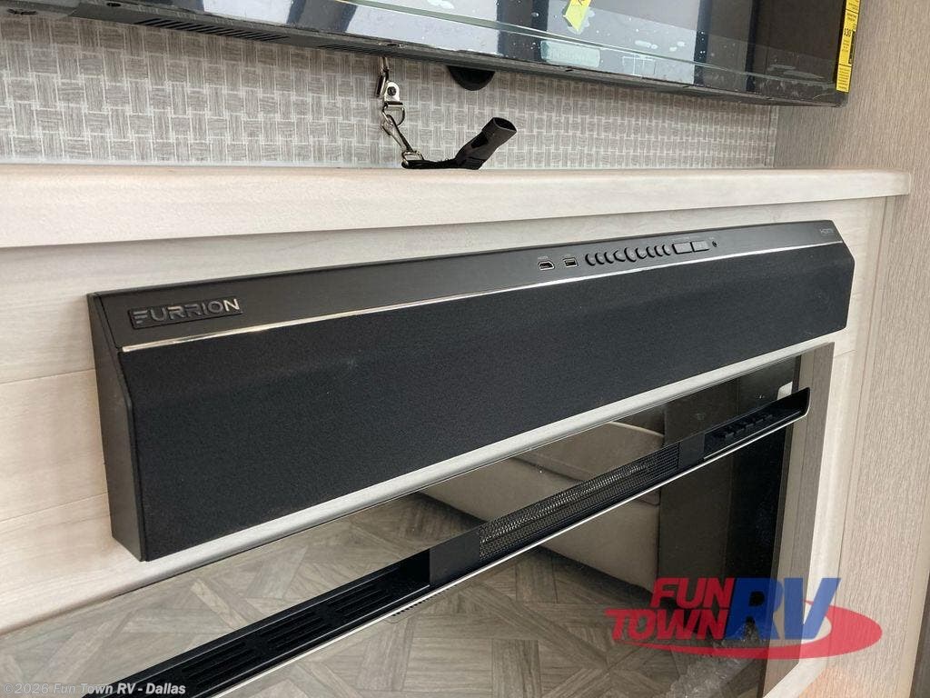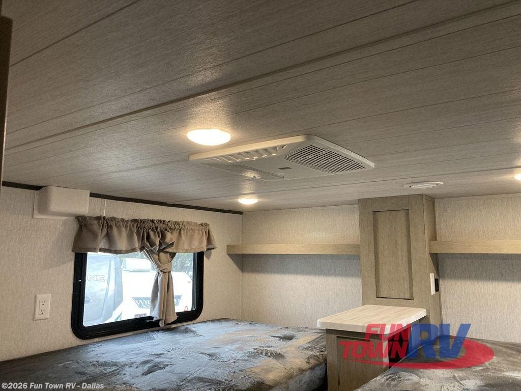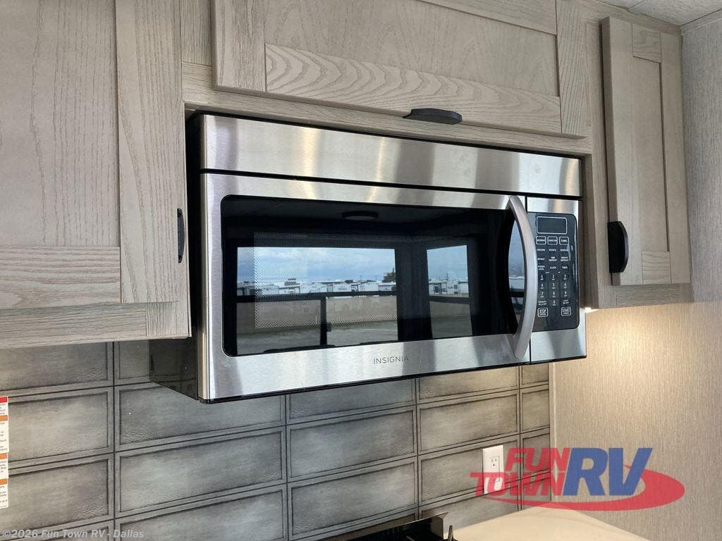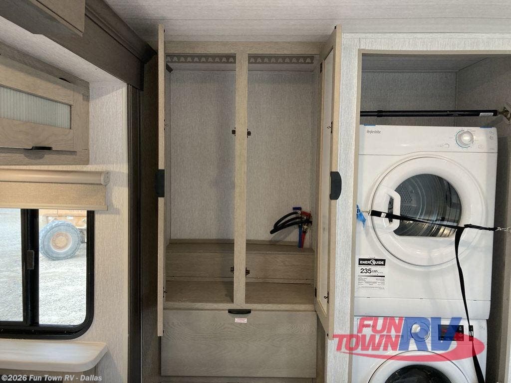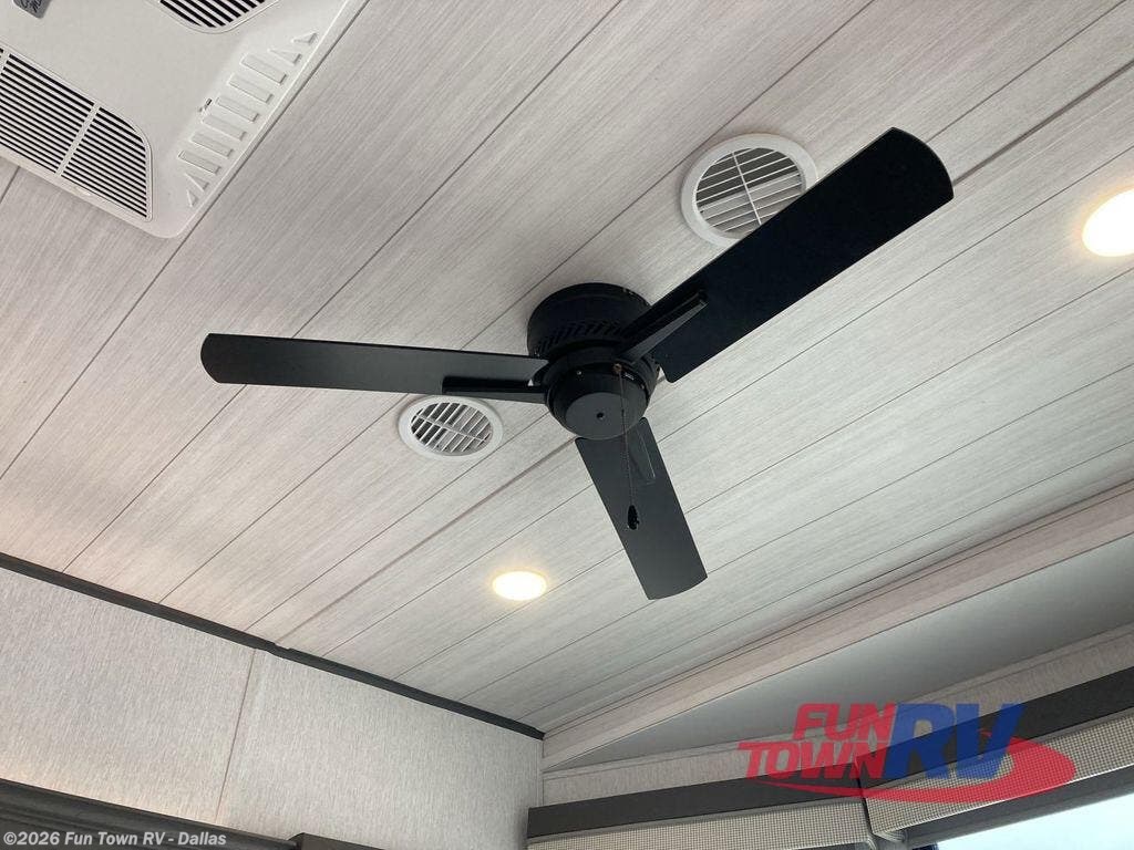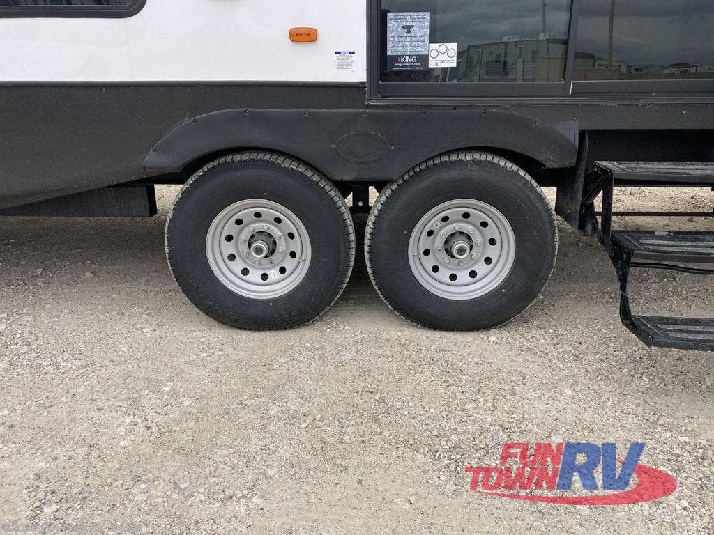 The grandkids will be begging to come along with you on your next getaway in this destination trailer! It features a double loft with three 42" x 74" bunk mats in total above the rear private bedroom. Inside the bedroom, you will find a king bed with Versa-Tilt slide and overhead cabinets, and a closet with optional washer/dryer prep if you want the option to go full-time. The walk-in shower with a seat will make it easy for everyone to stay fresh and clean as well. The living and kitchen area feature a kitchen island, a free standing dinette to enjoy meals and play games at, a front sofa, and theater seating across from the entertainment center with a fireplace for those crisp evenings!