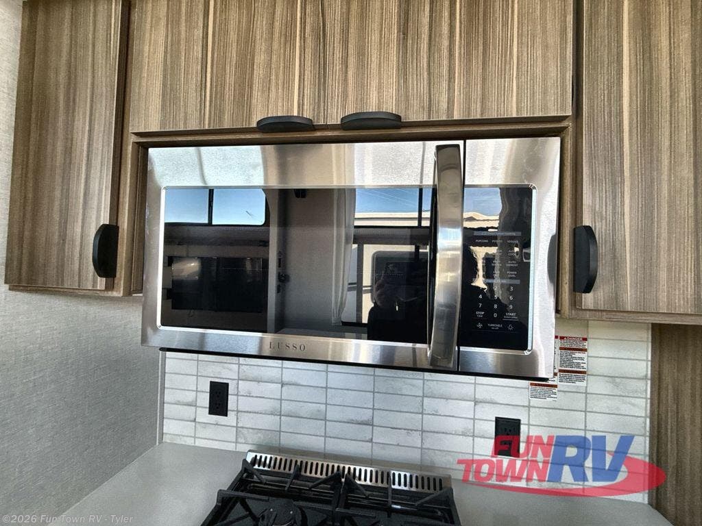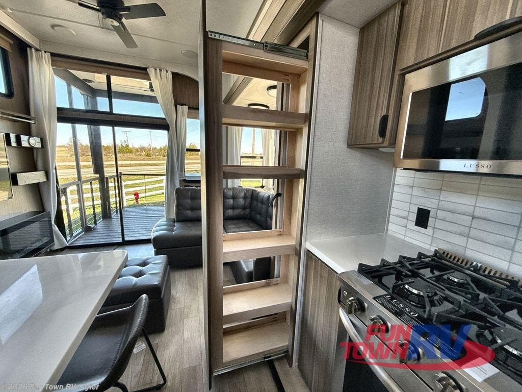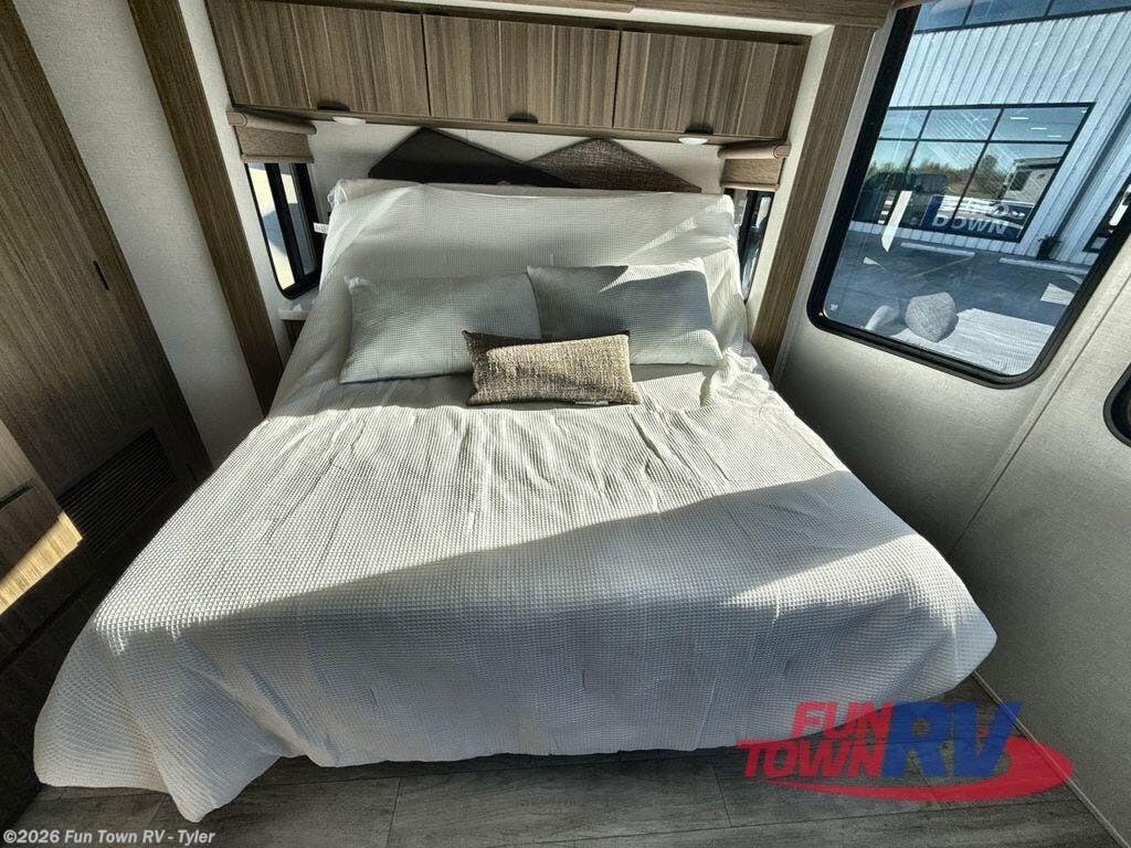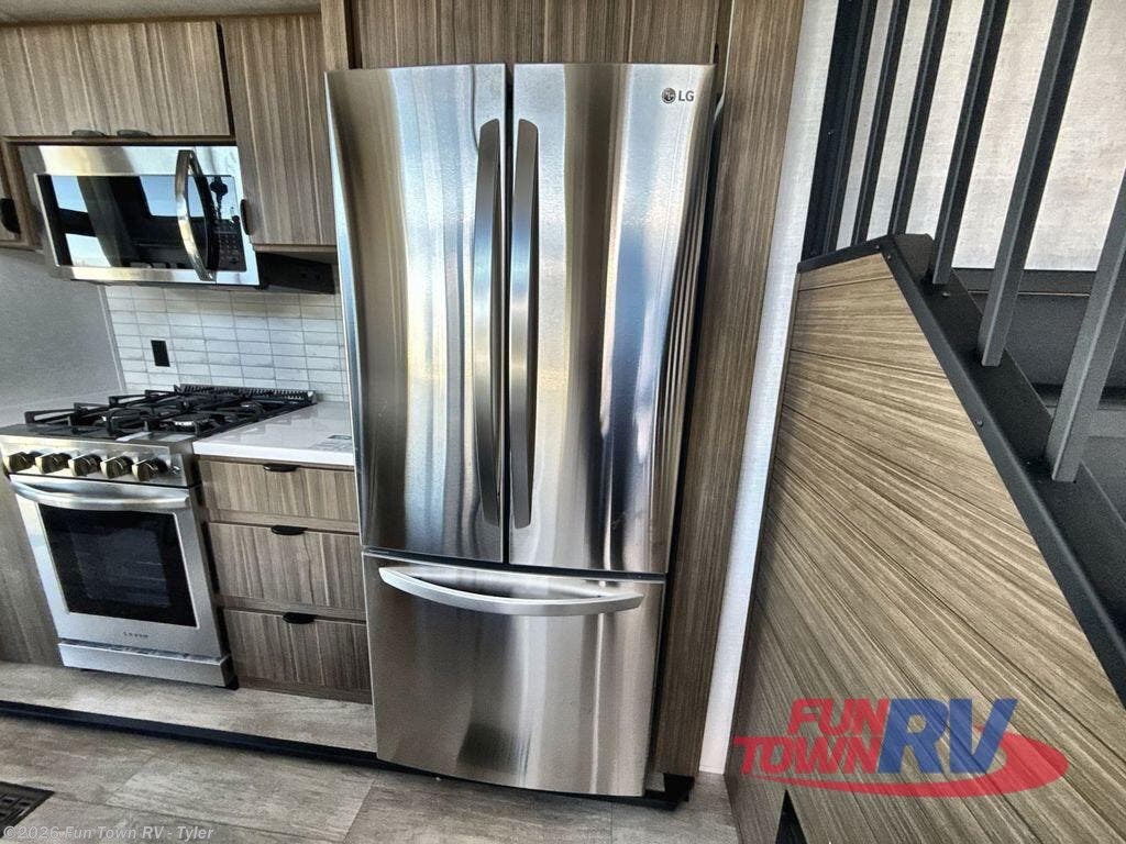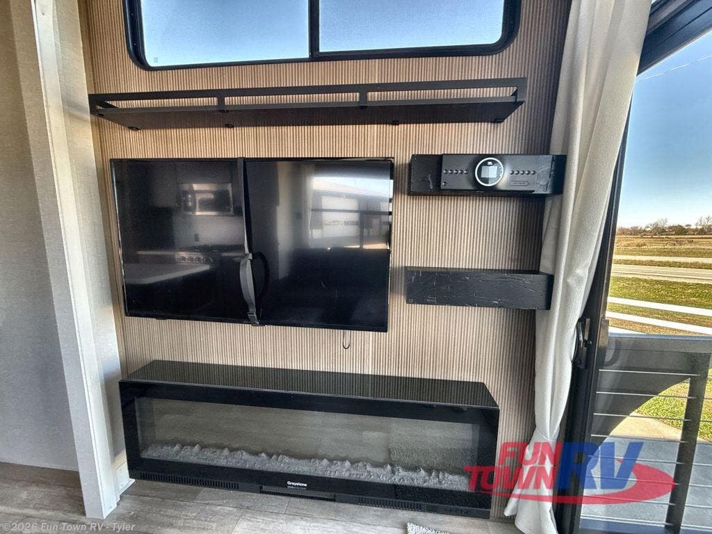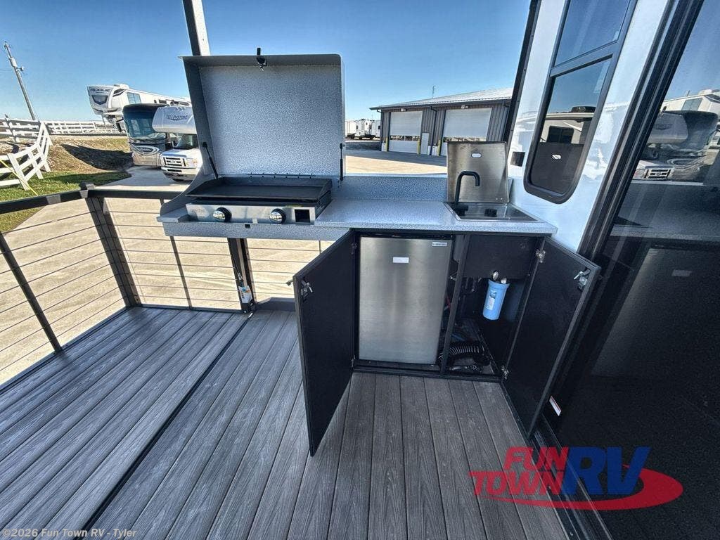 It won't be hard to find comfort in this spacious destination trailer for five to six! The rear covered veranda includes a ceiling fan to keep you cool as you cook on the exterior kitchen! Patio doors here will lead into the main living area that includes an L-shaped sofa with an ottoman plus an entertainment center with a fireplace for cooler evenings. A full kitchen is complete with all the appliances to make meals each day, a kitchen island with four chairs, plus a refrigerator and pantry for food storage. There is a front bedroom with a Versa-Tilt custom king bed slide out, a dresser and wardrobe plus a second wardrobe with washer and dryer prep if you choose to add those appliances. Your guests can make themselves at home in the loft that includes a queen bed, a cabinet with shelves, and a table with space below for feet if you want to eat up here or play a board game!