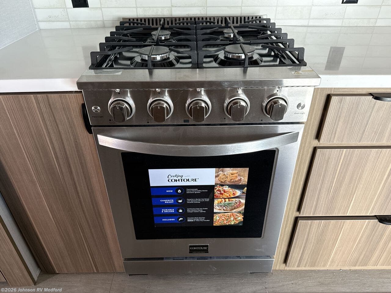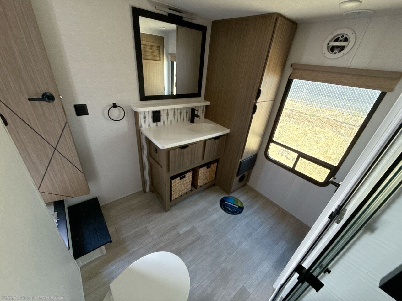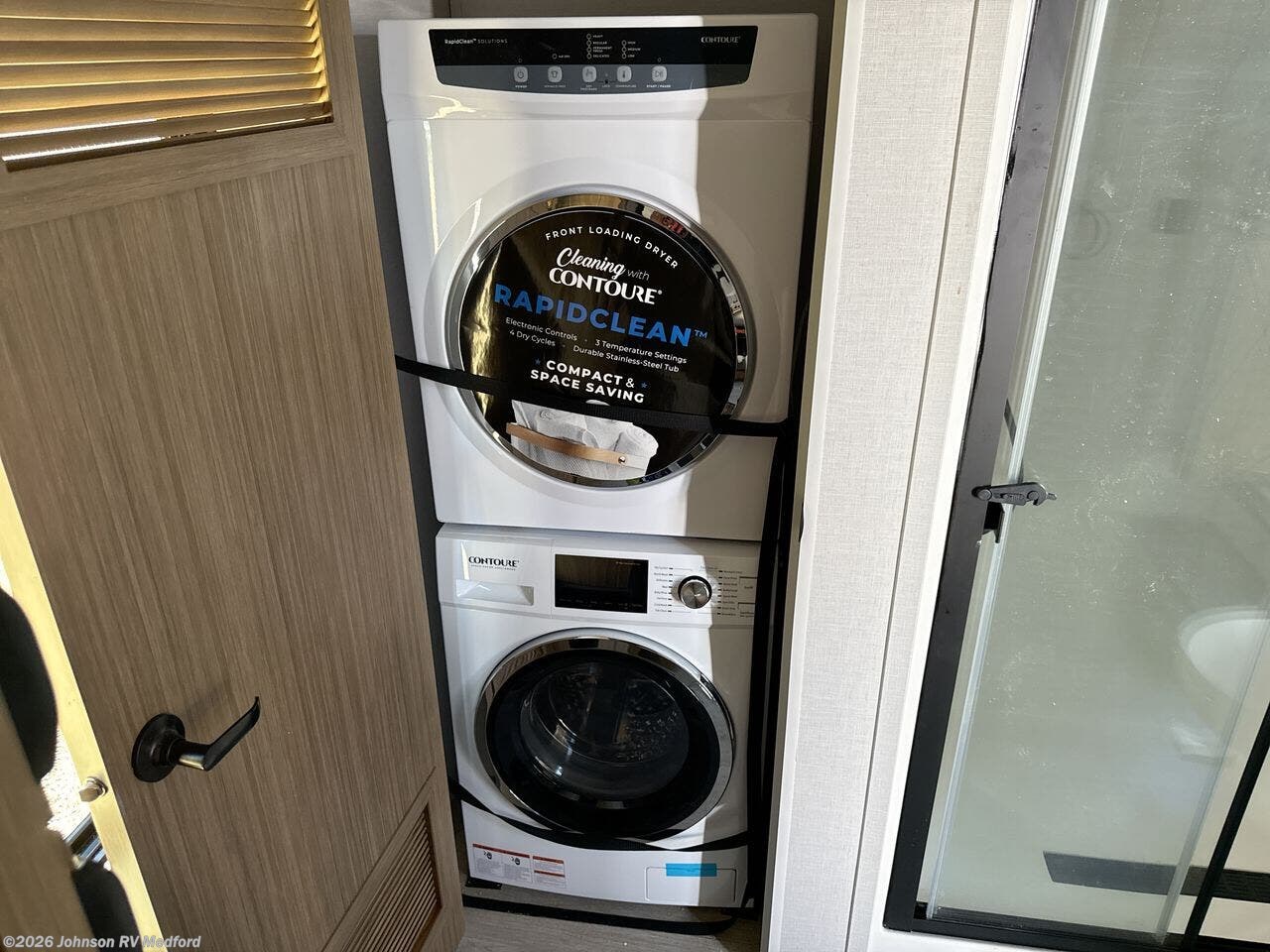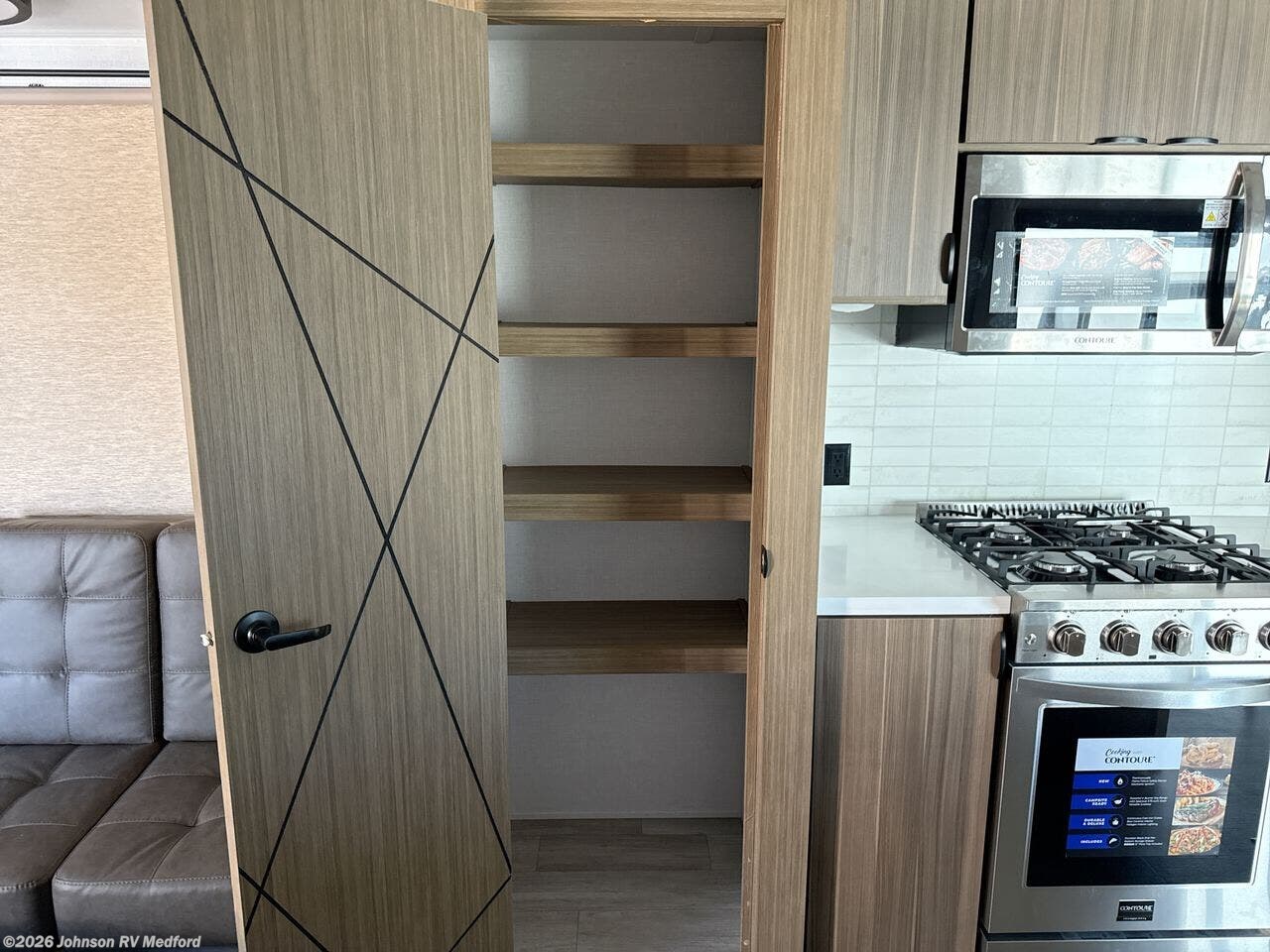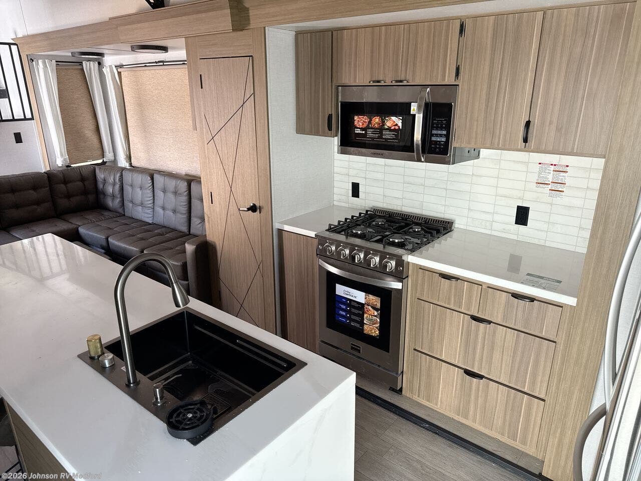 The 2025 Forest River Salem 42VIEW is a premium fifth wheel designed with social living and upscale comfort in mind. At approximately 44 feet long, this model features a dramatic rear lounge with full-height panoramic windows, theater-style seating, and a large entertainment center—perfect for gatherings or peaceful evenings indoors. The central kitchen is a highlight of this unit, with dual opposing slide-outs that create an open, generous workspace. It boasts a full-size residential refrigerator, stainless steel appliances, farmhouse sink, solid-surface countertops, and a spacious island—ideal for meal preparation and hosting. Up front, the private master suite offers a walk-around king bed, abundant wardrobe storage, and a well-appointed bath with a large OTR shower, solid-surface vanity, linen closet, and dual-sink setup—elevating the feel of home comfort on the road.