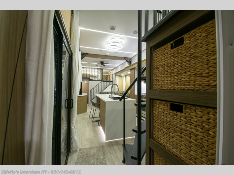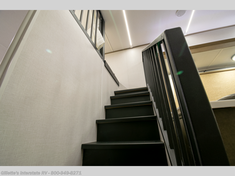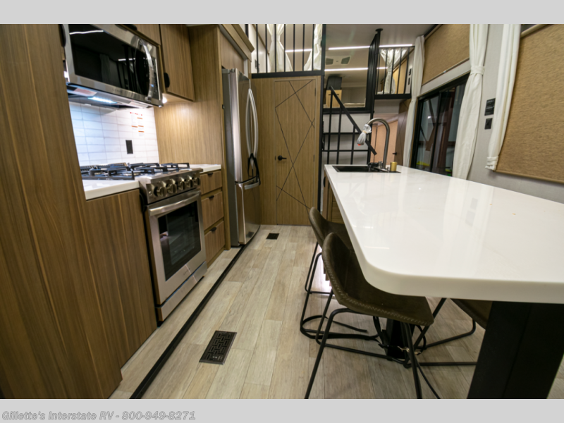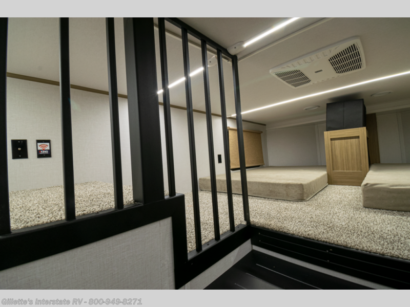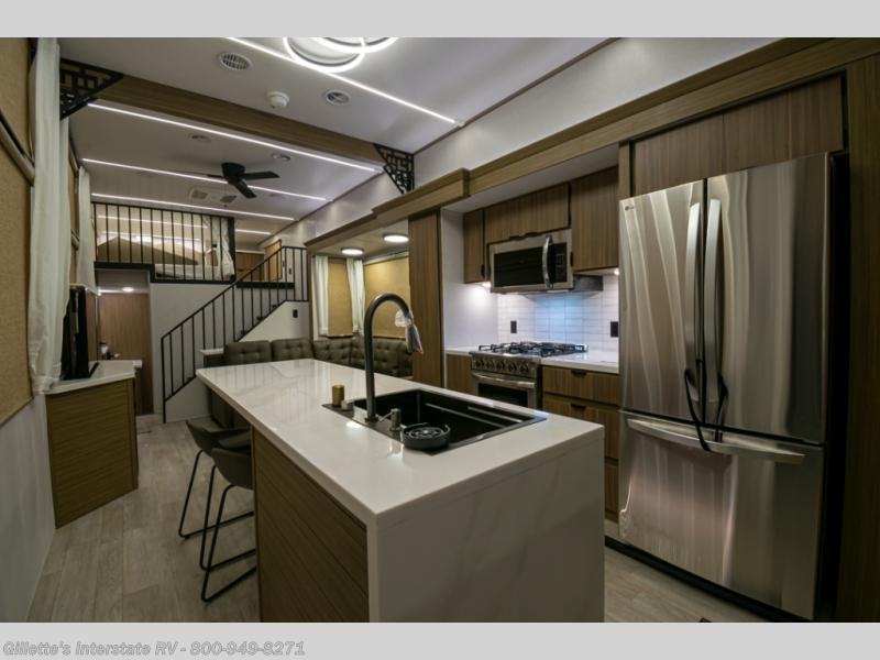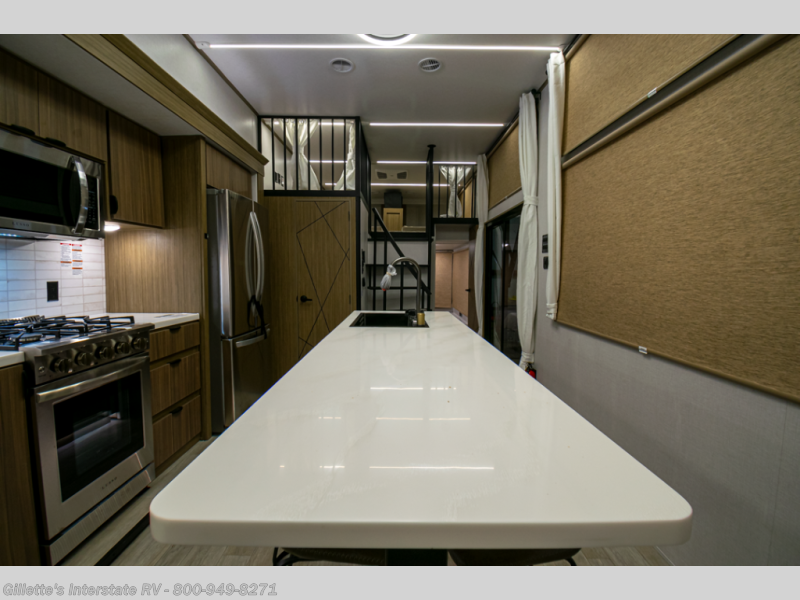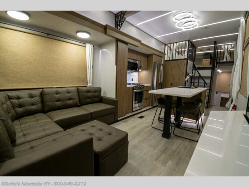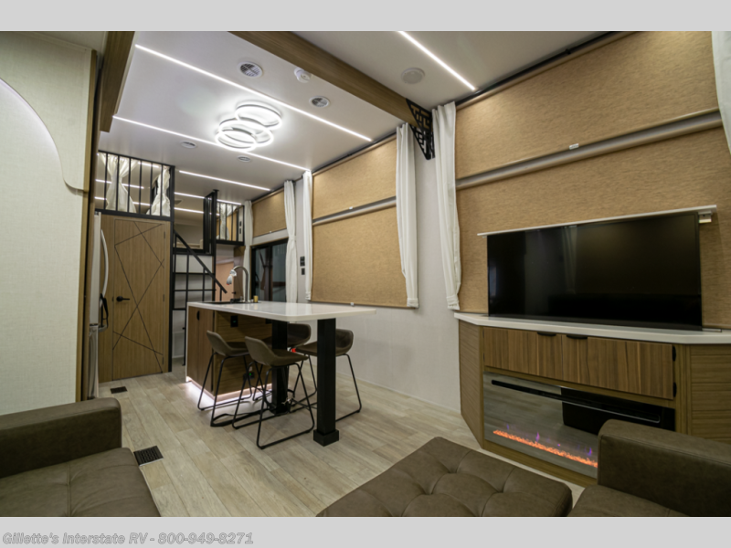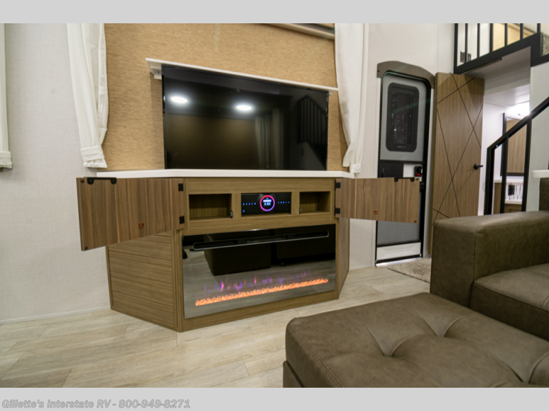You will feel like you are home when you step inside! Not only will you be impressed with the large slide in the main combined kitchen and living area, but check out the island with four seats! The main entry closest to the front features a step up to a private bedroom featuring a custom king bed with Versa-Tilt within a slide, plus a fireplace, wardrobe, and a dress for your belongings. Just outside this door is a half bath around the corner and a spiral staircase to the front loft with two 42" x 74" bunk mats above. The kitchen is fully equipped for you to provide the best home cooked meals with a roll-out pantry, range and microwave, plus side-by-side refrigerator all part of the large slide that also houses an L-shaped sectional sofa with ottoman so everyone can have a seat! Opposite the sectional find an entertainment center with pop-up TV and fireplace. A second set of stairs leads up to the rear loft featuring a 62" x 74" Versa Queen mattress and a dresser. Back down in the very back of the unit, there is a large bathroom with a walk-in shower, linen cabinet, toilet, and vanity with a sink. There is also a space that has washer/dryer prep to add even more convenience. Outside, a 26' awning for outdoor living, and double entry doors to make it easy to move in and out.