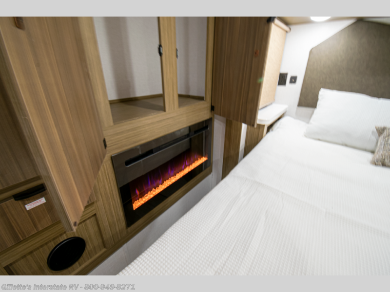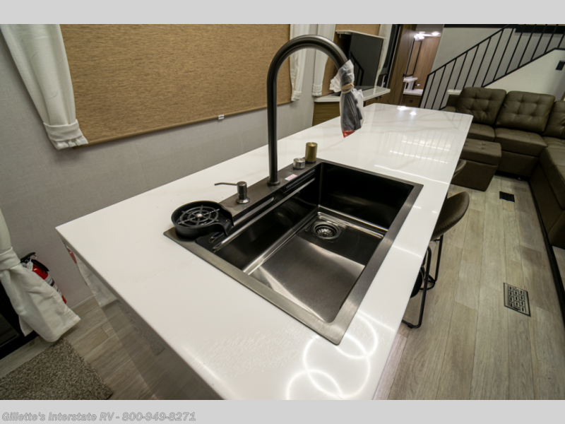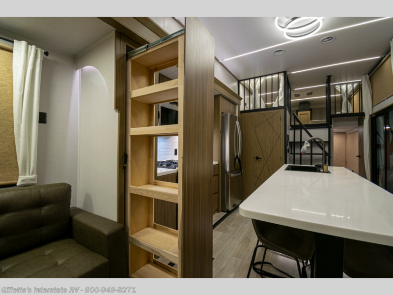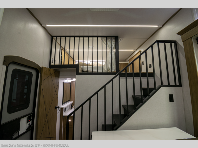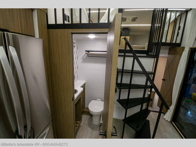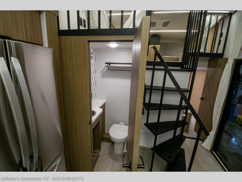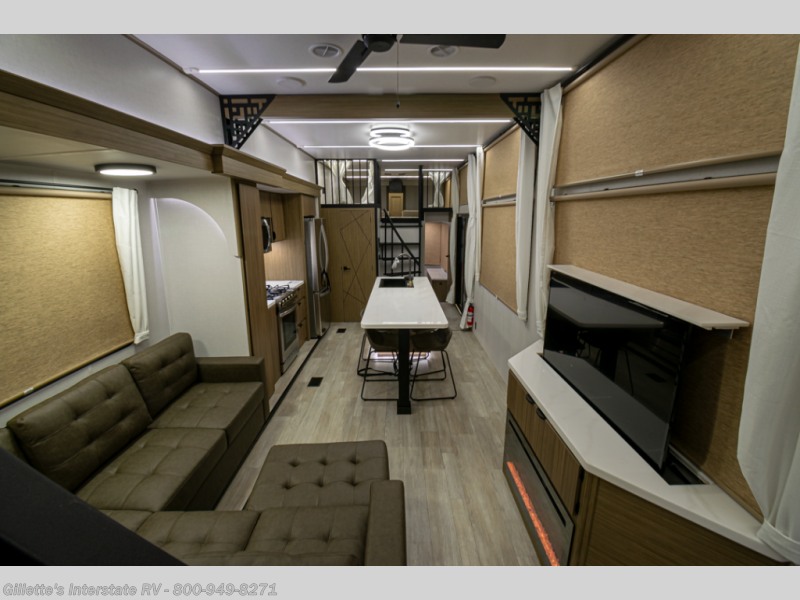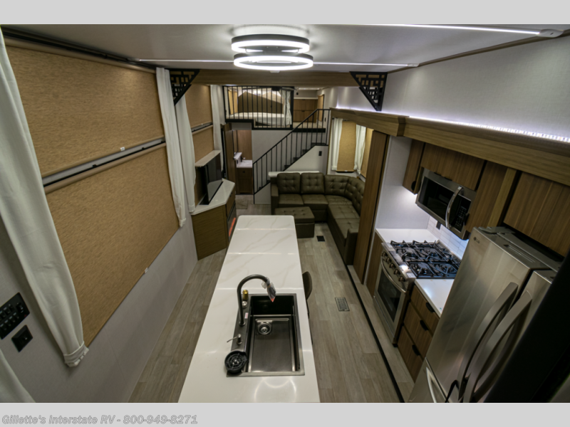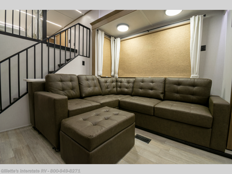 You will feel like you are home when you step inside! Not only will you be impressed with the large slide in the main combined kitchen and living area, but check out the island with four seats! The main entry closest to the front features a step up to a private bedroom featuring a custom king bed with Versa-Tilt within a slide, plus a fireplace, wardrobe, and a dress for your belongings. Just outside this door is a half bath around the corner and a spiral staircase to the front loft with two 42" x 74" bunk mats above. The kitchen is fully equipped for you to provide the best home cooked meals with a roll-out pantry, range and microwave, plus side-by-side refrigerator all part of the large slide that also houses an L-shaped sectional sofa with ottoman so everyone can have a seat! Opposite the sectional find an entertainment center with pop-up TV and fireplace. A second set of stairs leads up to the rear loft featuring a 62" x 74" Versa Queen mattress and a dresser. Back down in the very back of the unit, there is a large bathroom with a walk-in shower, linen cabinet, toilet, and vanity with a sink. There is also a space that has washer/dryer prep to add even more convenience. Outside, a 26' awning for outdoor living, and double entry doors to make it easy to move in and out.