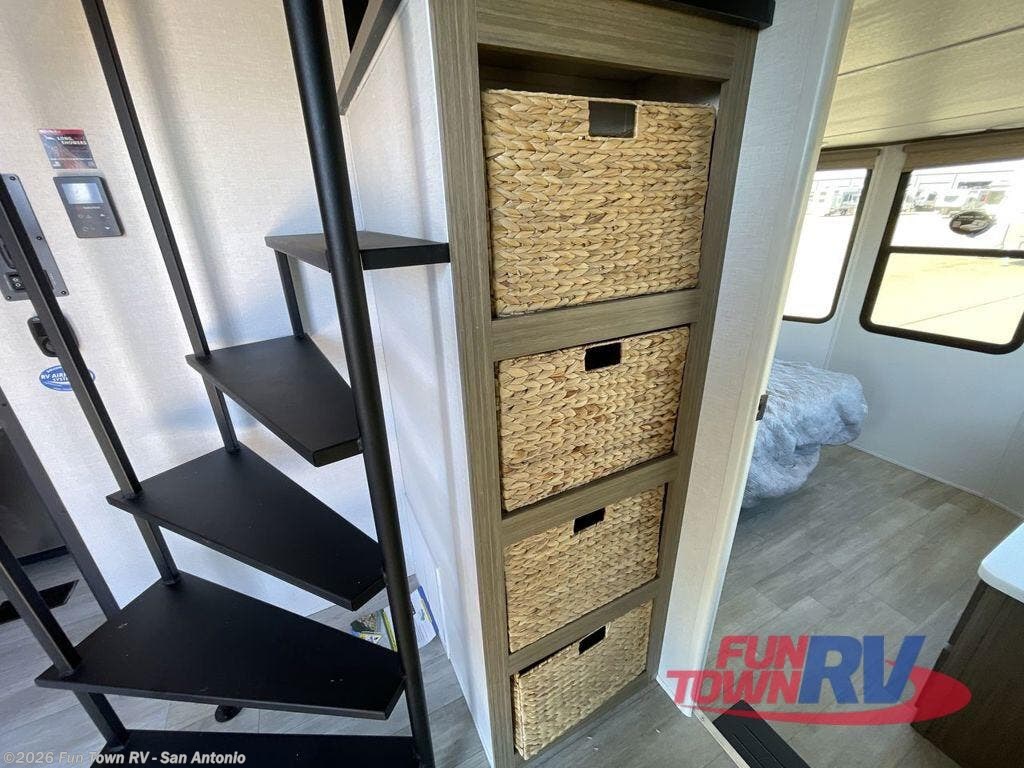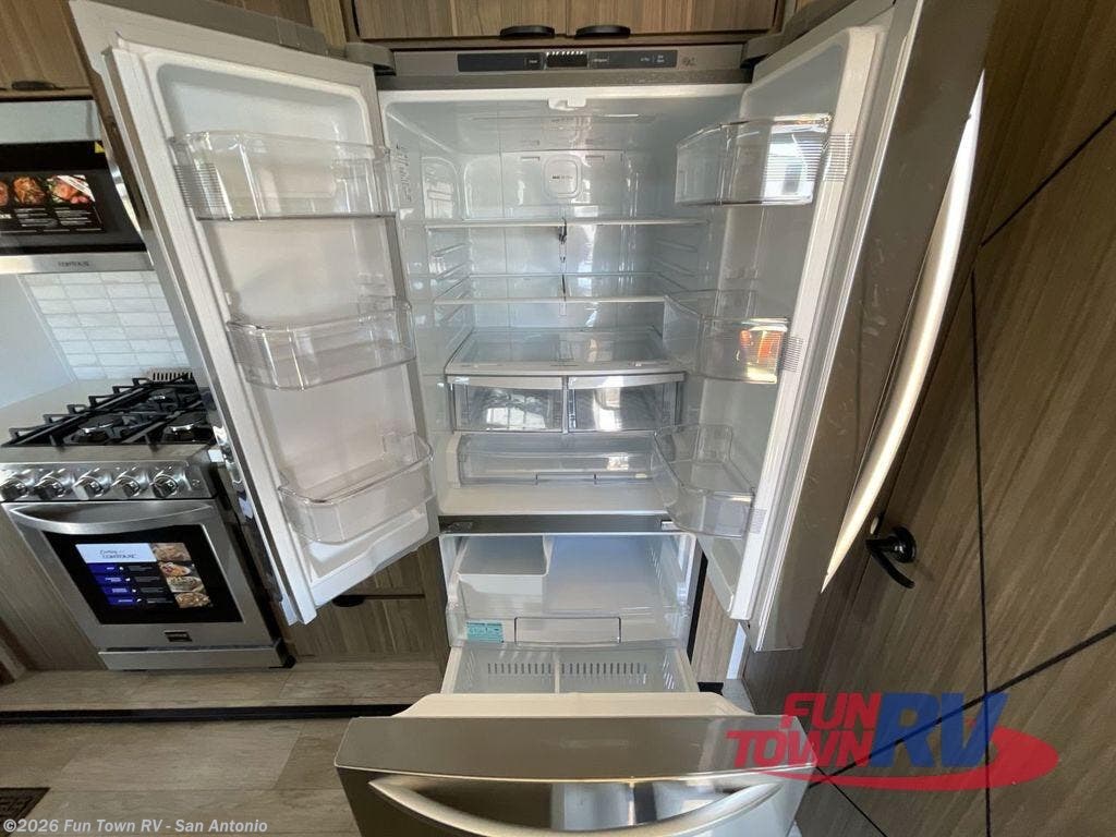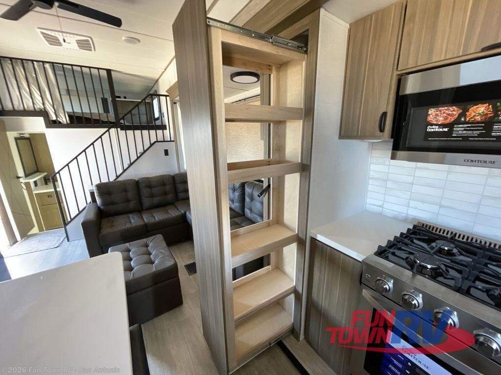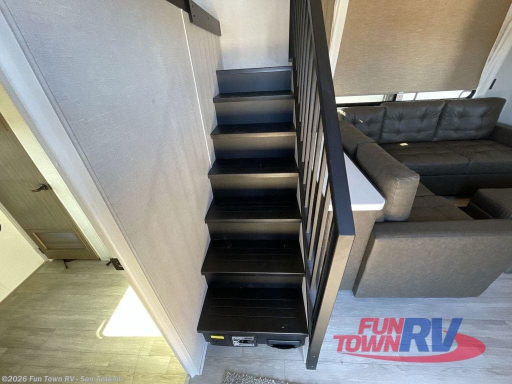 You will feel like you are home when you step inside! Not only will you be impressed with the large slide in the main combined kitchen and living area, but check out the island with four seats! The main entry closest to the front features a step up to a private bedroom featuring a custom king bed with Versa-Tilt within a slide, plus a fireplace, wardrobe, and a dress for your belongings. Just outside this door is a half bath around the corner and a spiral staircase to the front loft with two 42" x 74" bunk mats above. The kitchen is fully equipped for you to provide the best home cooked meals with a roll-out pantry, range and microwave, plus side-by-side refrigerator all part of the large slide that also houses an L-shaped sectional sofa with ottoman so everyone can have a seat! Opposite the sectional find an entertainment center with pop-up TV and fireplace. A second set of stairs leads up to the rear loft featuring a 62" x 74" Versa Queen mattress and a dresser. Back down in the very back of the unit, there is a large bathroom with a walk-in shower, linen cabinet, toilet, and vanity with a sink. There is also a space that has washer/dryer prep to add even more convenience. Outside, a 26' awning for outdoor living, and double entry doors to make it easy to move in and out.