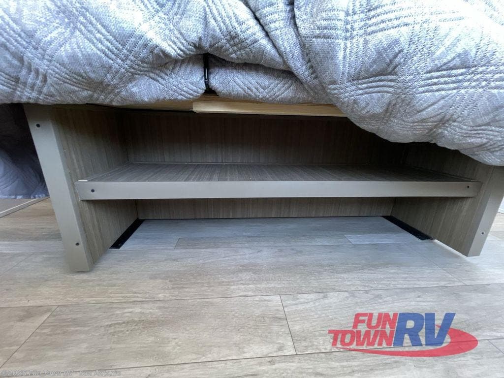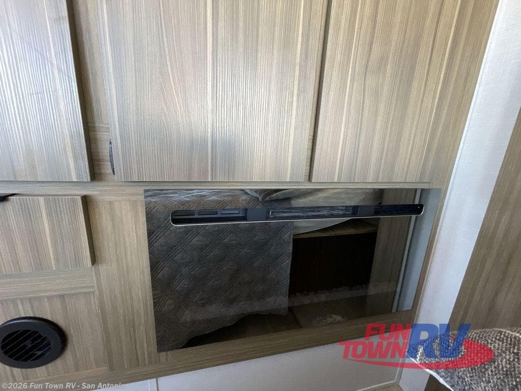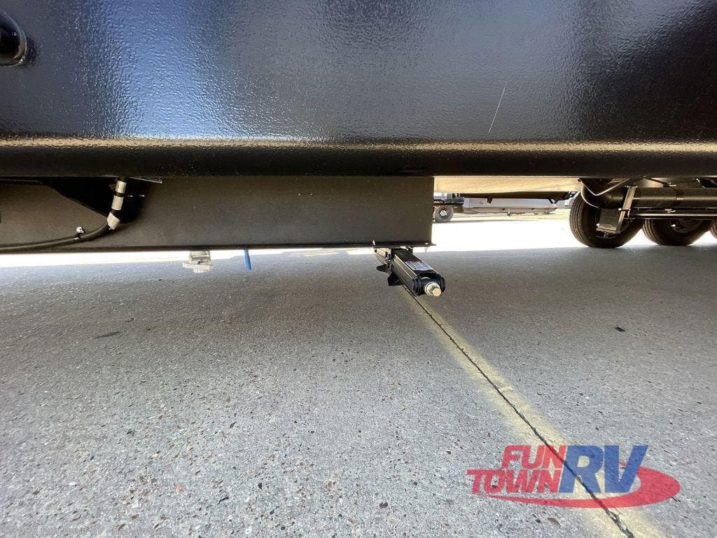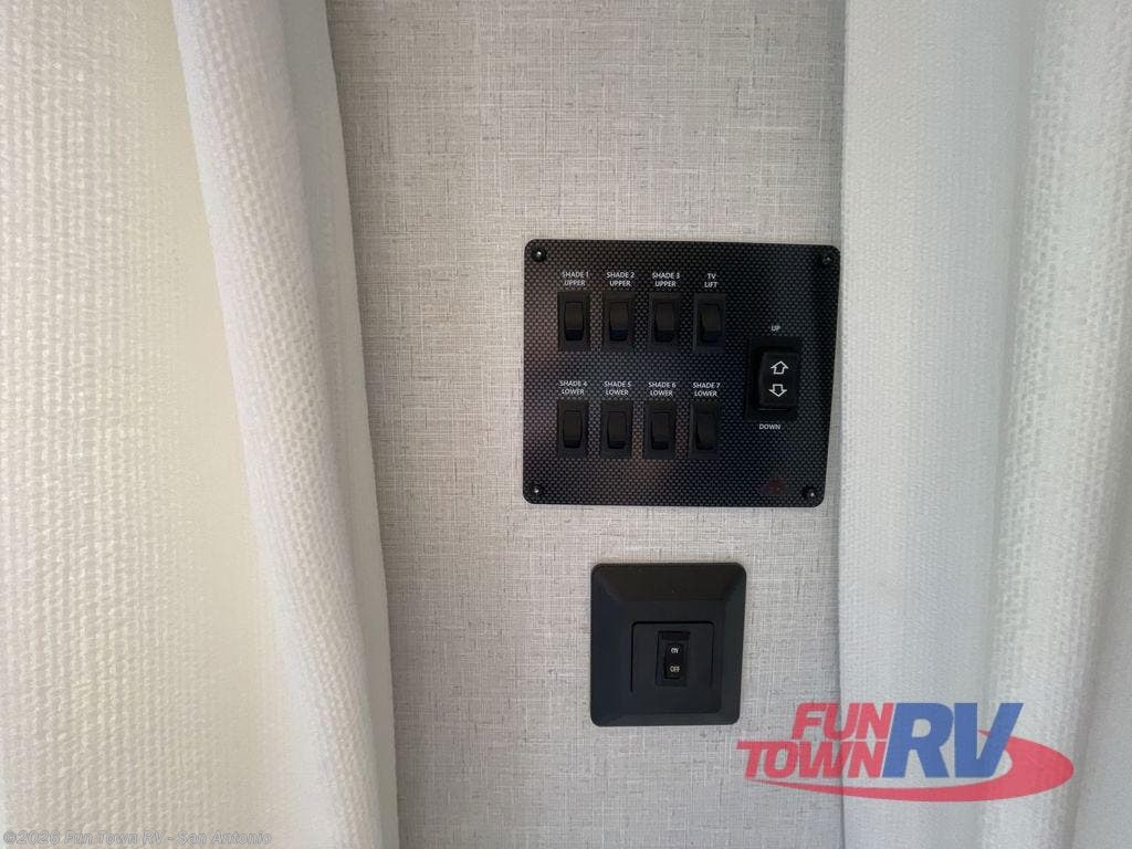 You will feel like you are home when you step inside! Not only will you be impressed with the large slide in the main combined kitchen and living area, but check out the island with four seats! The main entry closest to the front features a step up to a private bedroom featuring a custom king bed with Versa-Tilt within a slide, plus a fireplace, wardrobe, and a dress for your belongings. Just outside this door is a half bath around the corner and a spiral staircase to the front loft with two 42" x 74" bunk mats above. The kitchen is fully equipped for you to provide the best home cooked meals with a roll-out pantry, range and microwave, plus side-by-side refrigerator all part of the large slide that also houses an L-shaped sectional sofa with ottoman so everyone can have a seat! Opposite the sectional find an entertainment center with pop-up TV and fireplace. A second set of stairs leads up to the rear loft featuring a 62" x 74" Versa Queen mattress and a dresser. Back down in the very back of the unit, there is a large bathroom with a walk-in shower, linen cabinet, toilet, and vanity with a sink. There is also a space that has washer/dryer prep to add even more convenience. Outside, a 26' awning for outdoor living, and double entry doors to make it easy to move in and out.