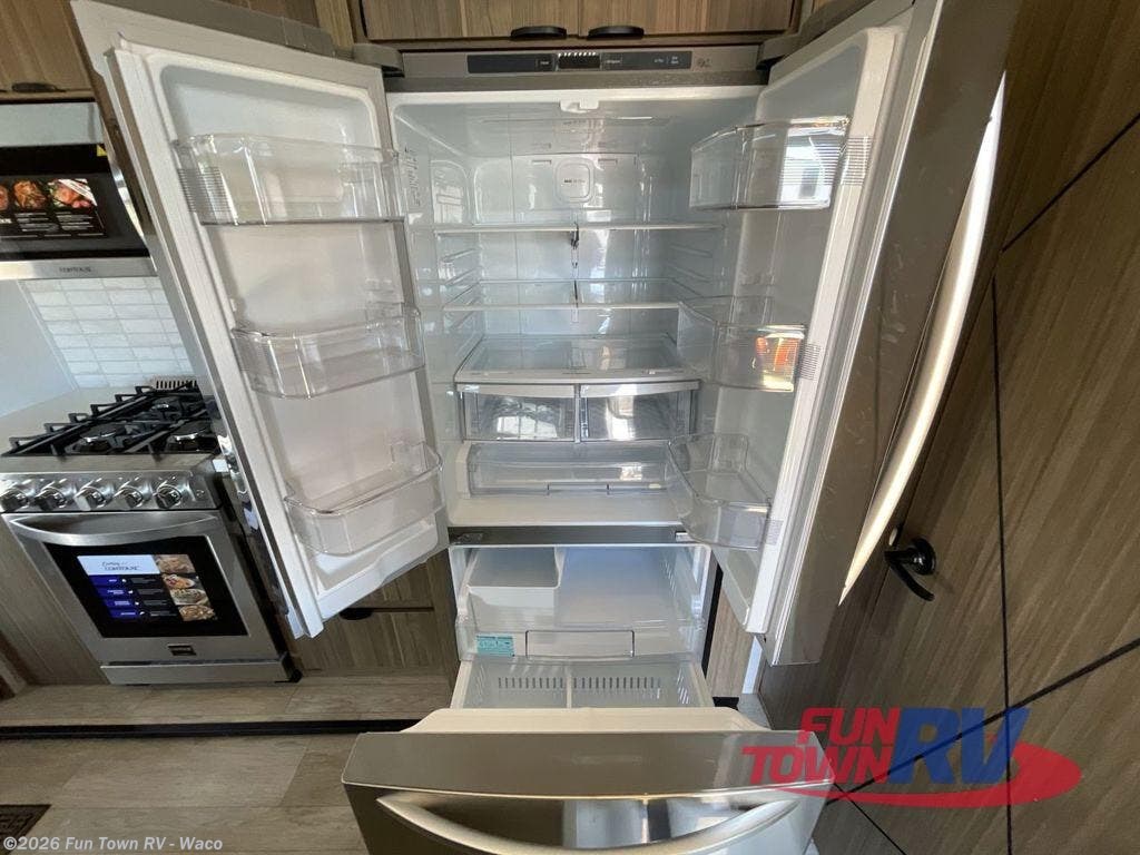 You will feel like you are home when you step inside! Not only will you be impressed with the large slide in the main combined kitchen and living area, but check out the island with four seats! The main entry closest to the front features a step up to a private bedroom featuring a custom king bed with Versa-Tilt within a slide, plus a fireplace, wardrobe, and a dress for your belongings. Just outside this door is a half bath around the corner and a spiral staircase to the front loft with two 42" x 74" bunk mats above. The kitchen is fully equipped for you to provide the best home cooked meals with a roll-out pantry, range and microwave, plus side-by-side refrigerator all part of the large slide that also houses an L-shaped sectional sofa with ottoman so everyone can have a seat! Opposite the sectional find an entertainment center with pop-up TV and fireplace. A second set of stairs leads up to the rear loft featuring a 62" x 74" Versa Queen mattress and a dresser. Back down in the very back of the unit, there is a large bathroom with a walk-in shower, linen cabinet, toilet, and vanity with a sink. There is also a space that has washer/dryer prep to add even more convenience. Outside, a 26' awning for outdoor living, and double entry doors to make it easy to move in and out.