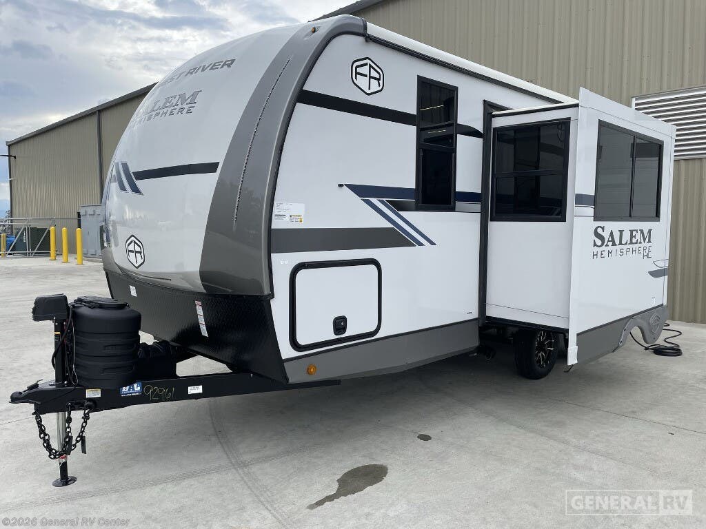 Experience the perfect blend of style and comfort with the 2025 Forest River Salem Hemisphere Hyper-Lyte 19RBHL. This travel trailer is designed for couples seeking adventure without compromising on luxury. At just under 24 feet, it offers a spacious retreat with a thoughtfully designed center kitchen and living area. The full-size electric refrigerator and three-burner cooktop make meal prep a breeze, while the panoramic windows and theater seating create an inviting space to unwind. The versatile removable table adds flexibility for dining or working on the go. The rear bath is a sanctuary with a walk-in shower and porcelain toilet, ensuring your comfort on the road. The queen bed with Versa-Tilt feature promises restful nights after days filled with exploration. Ample storage, including XL Texas-size pass-through compartments, ensures you have room for all your gear. With a powered 14-foot awning, you can effortlessly extend your living space outdoors. Discover the joy of travel in the Salem Hemisphere Hyper-Lyte 19RBHL, and make every journey memorable. For more details, visit your nearest General RV dealership.