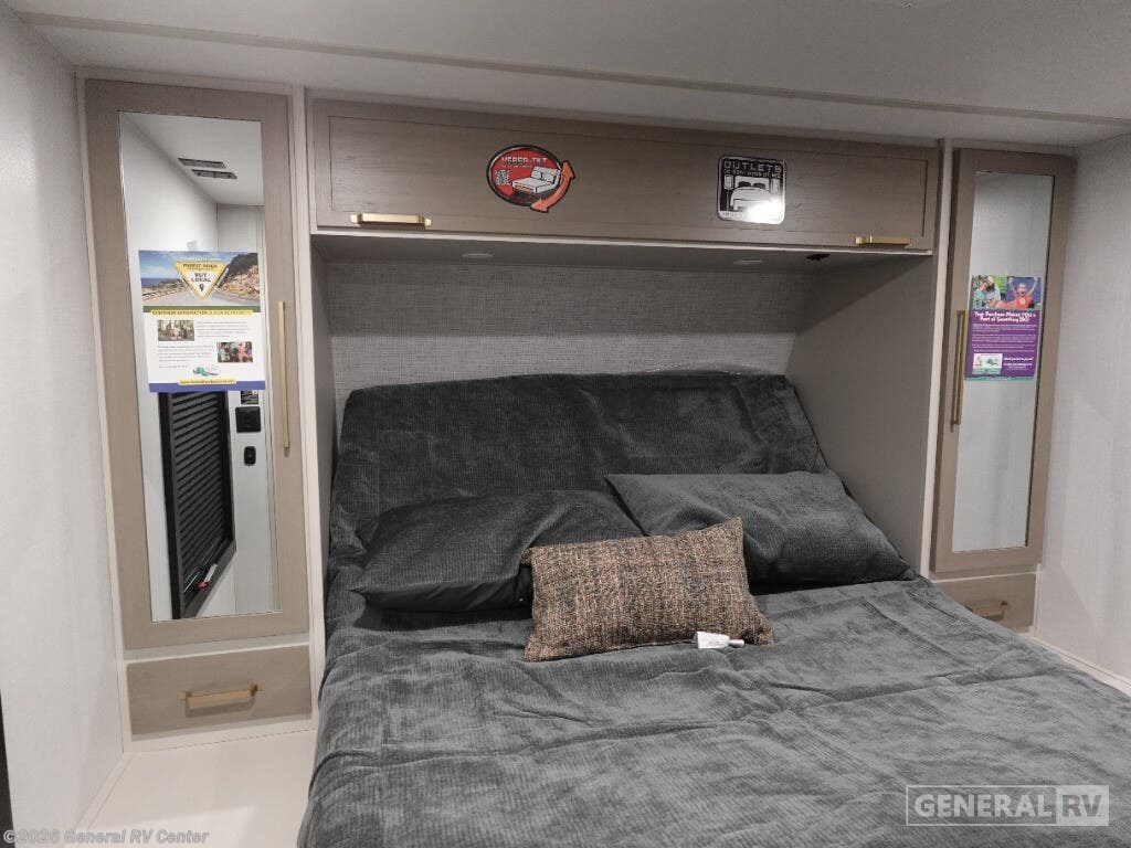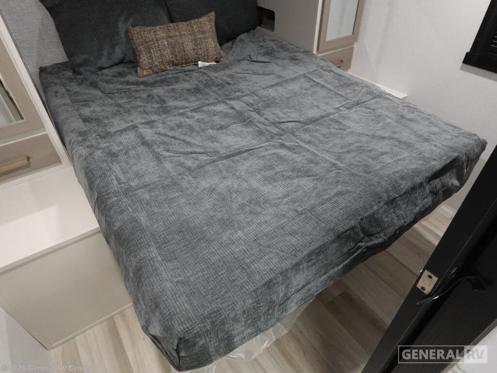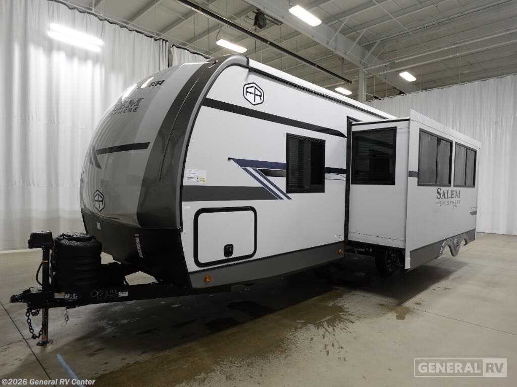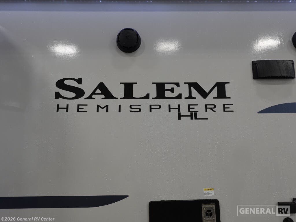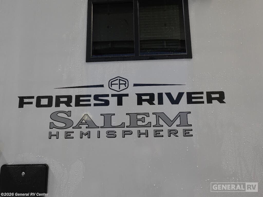Welcome to the 2025 Forest River Salem Hemisphere Hyper-Lyte 25RBHL, where style meets functionality in a travel trailer designed for both comfort and adventure. This RV offers a spacious and inviting interior, perfect for couples or small families. The front bedroom features a luxurious queen bed with a Versa-Tilt mechanism, ensuring a restful night's sleep. The center of the trailer boasts a well-appointed kitchen with a full-size electric refrigerator and a three-burner cooktop, making meal preparation a breeze. As you relax in the theater seating or enjoy a meal at the booth dinette, the panoramic windows provide stunning views of your surroundings. The rear bath is a highlight, offering a walk-in shower with a skylight, bringing a touch of spa-like luxury to your travels. With ample storage, including XL Texas-sized pass-through compartments, this RV ensures you have room for all your gear. The 18 ft. powered retractable awning creates an inviting outdoor space, perfect for enjoying fresh air and nature. Whether you're hitting the road for a weekend getaway or an extended journey, the Salem Hemisphere Hyper-Lyte 25RBHL promises a memorable and comfortable experience. For more details, visit your nearest General RV dealership today!