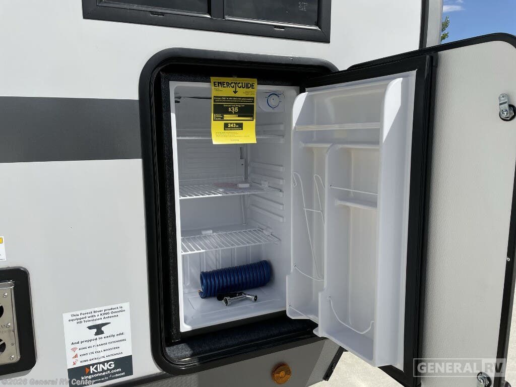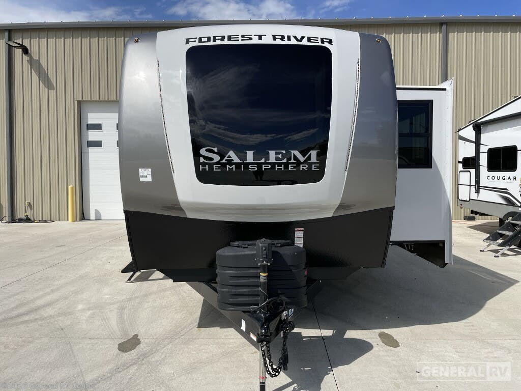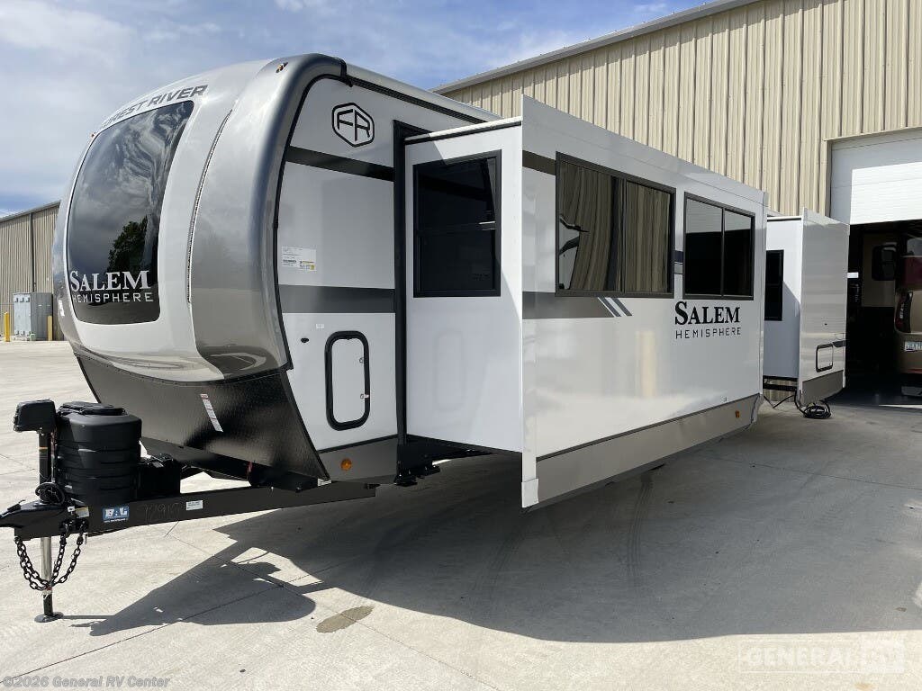 Experience the ultimate in RV living with the 2025 Forest River Salem Hemisphere 270FKS. This beautifully designed travel trailer invites you into a world of comfort and style, featuring a spacious front kitchen equipped with all the essentials for culinary adventures on the road. The full-size electric refrigerator ensures you have ample space for all your fresh ingredients, while the three-burner cooktop makes meal preparation a breeze. Imagine savoring your morning coffee with a panoramic view through the large windows, bringing the beauty of the outdoors right to your dining area. As you move through the center living area, you'll be greeted by plush theater seating perfect for relaxing evenings, and an entertainment center complete with a cozy fireplace to set the perfect ambiance. The rear bedroom offers a luxurious king-sized bed, promising restful nights after a day of exploration. With washer and dryer prep included, this RV ensures you have all the conveniences of home. The 19-foot powered retractable awning extends your living space outdoors, providing a shaded retreat for alfresco dining or simply basking in nature's serenity. Discover the perfect blend of functionality and elegance in the Salem Hemisphere 270FKS, where every journey becomes a cherished memory. For more details, visit your nearest General RV dealership location.