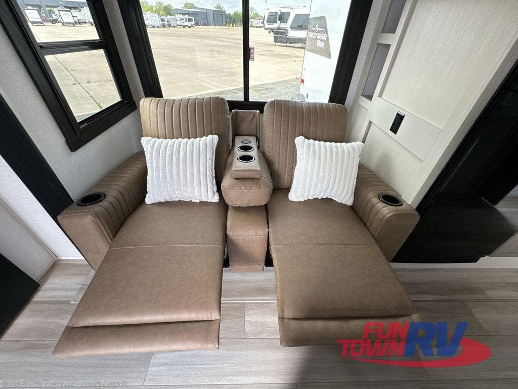 This is the perfect couple's trailer for weekend trips to the campground. The middle kitchen includes ample counter space with two stools where you can enjoy your breakfast at. You can relax on the theater seat within the slide out here, and the pantry and 12V refrigerator is close by so you can grab a snack. A front private bedroom includes a king bed slide out, a large front wardrobe with washer and dryer prep, a dresser, and a vanity with an ottoman. The full rear bath includes dual bath sinks, a walk-in shower with a skylights, and a linen closet to keep towels close by.