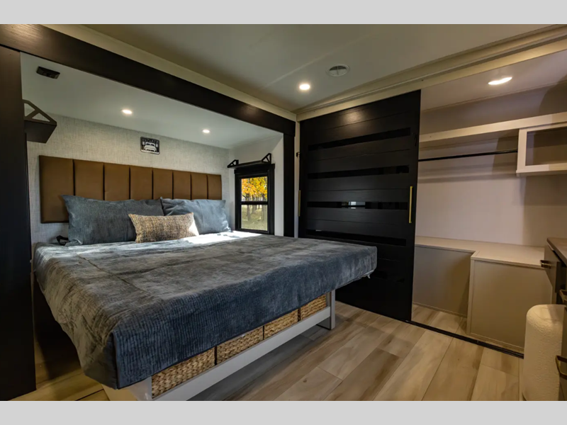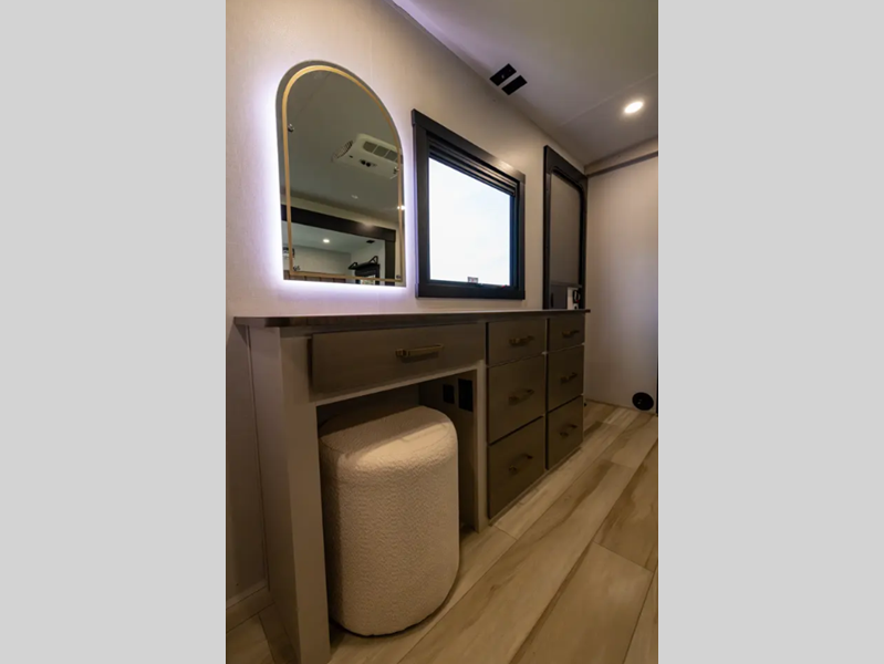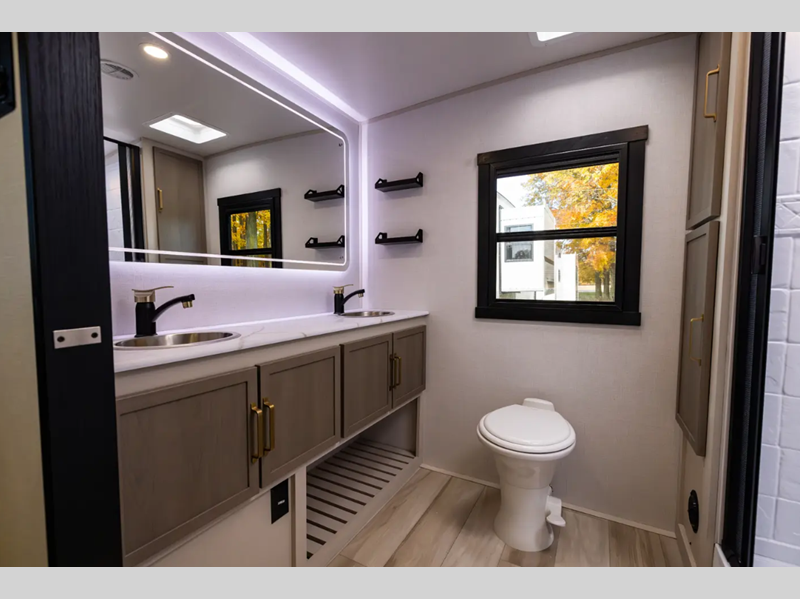 This is the perfect couple's trailer for weekend trips to the campground. The middle kitchen includes ample counter space with two stools where you can enjoy your breakfast at. You can relax on the theater seat within the slide out here, and the pantry and 12V refrigerator is close by so you can grab a snack. A front private bedroom includes a king bed slide out, a large front wardrobe with washer and dryer prep, a dresser, and a vanity with an ottoman. The full rear bath includes dual bath sinks, a walk-in shower with a skylights, and a linen closet to keep towels close by.
