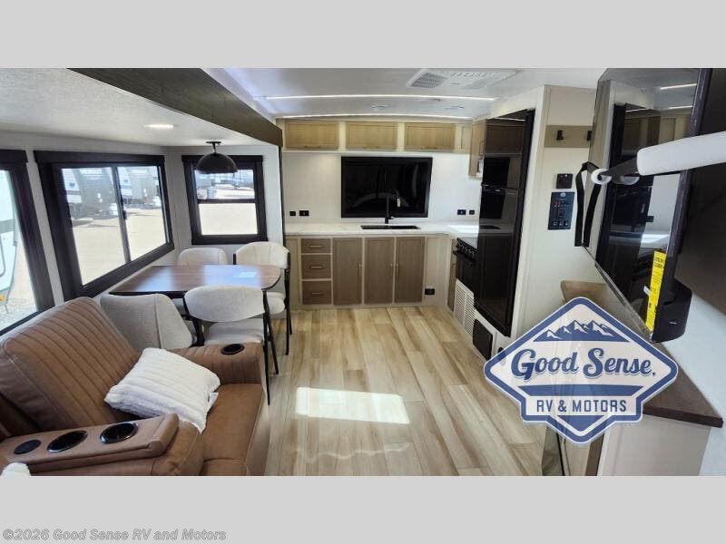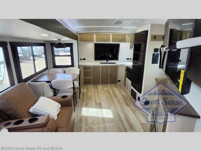Once you step inside this dual entry travel trailer, you won't want to camp any other way! The rear private bedroom will have you feeling right at home with the custom king bed across from a dresser with a TV hookup, a large bedroom wardrobe, and there is even a closet with washer/dryer prep. The dual entry bath makes it easy for everyone to access and it has a radius shower with a skylight above for added natural lighting as you get ready each morning. Both the theater seating and the booth dinette have a panoramic window for you to look out at your beautiful scenery. The chef of the group will love cooking in the front kitchen with all of the extra countertop space, as well as outdoors with the outside kitchen!