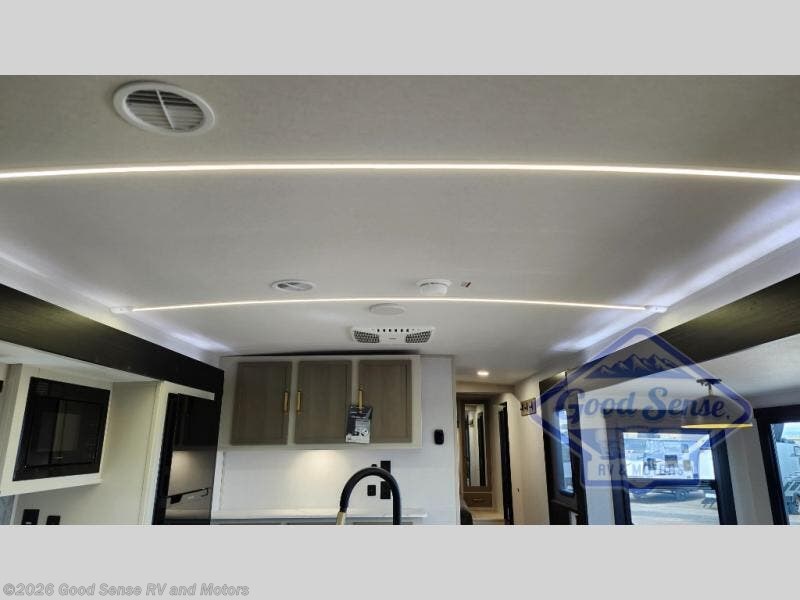 Step inside this luxurious travel trailer and see all that it has to offer! You will enjoy a good night's rest each night on the queen bed with Versa Tilt with wardrobes on either side to keep your clothes wrinkle free, and if you have a couple of guests then you can convert the rear tri-fold sofa or the booth dinette into a sleeping space. The 30" x 36" walk-in shower with a skylight above invites you to take a hot, steamy shower after a fun-filled day outdoors. Once you're cleaned up, you can grab some leftovers from the 10 cu. ft. 12V black refrigerator and warm it up in the microwave. There is also theatre seating across from the 50" LED TV with a fireplace below!