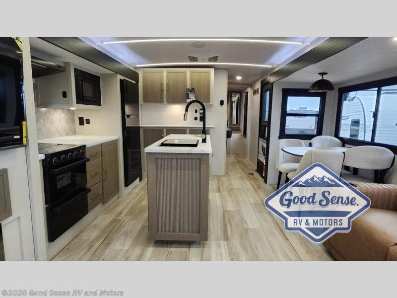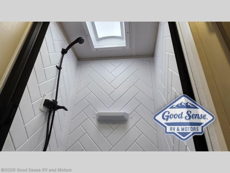 Step inside this luxurious travel trailer and see all that it has to offer! You will enjoy a good night's rest each night on the queen bed with Versa Tilt with wardrobes on either side to keep your clothes wrinkle free, and if you have a couple of guests then you can convert the rear tri-fold sofa or the booth dinette into a sleeping space. The 30" x 36" walk-in shower with a skylight above invites you to take a hot, steamy shower after a fun-filled day outdoors. Once you're cleaned up, you can grab some leftovers from the 10 cu. ft. 12V black refrigerator and warm it up in the microwave. There is also theatre seating across from the 50" LED TV with a fireplace below!