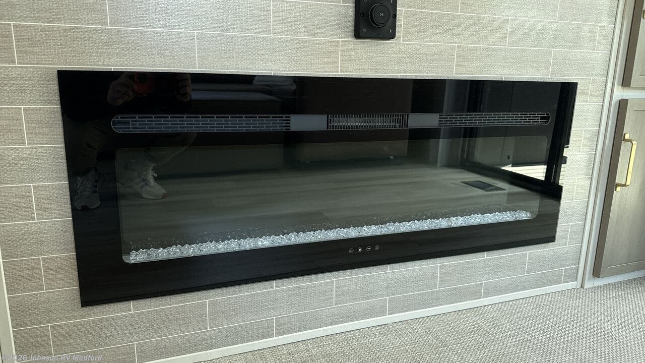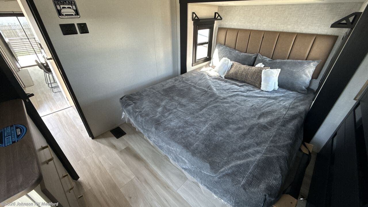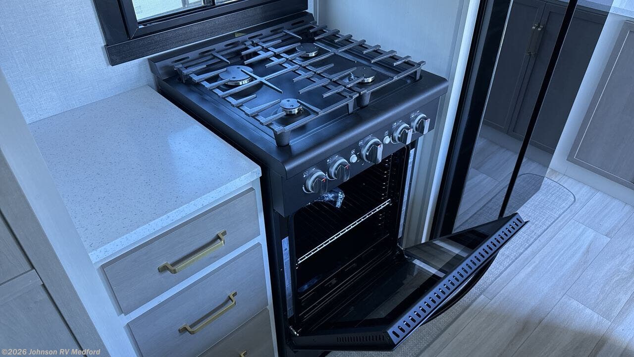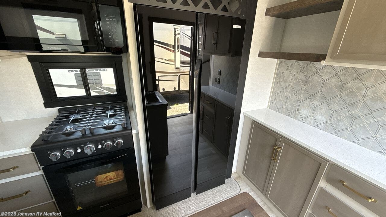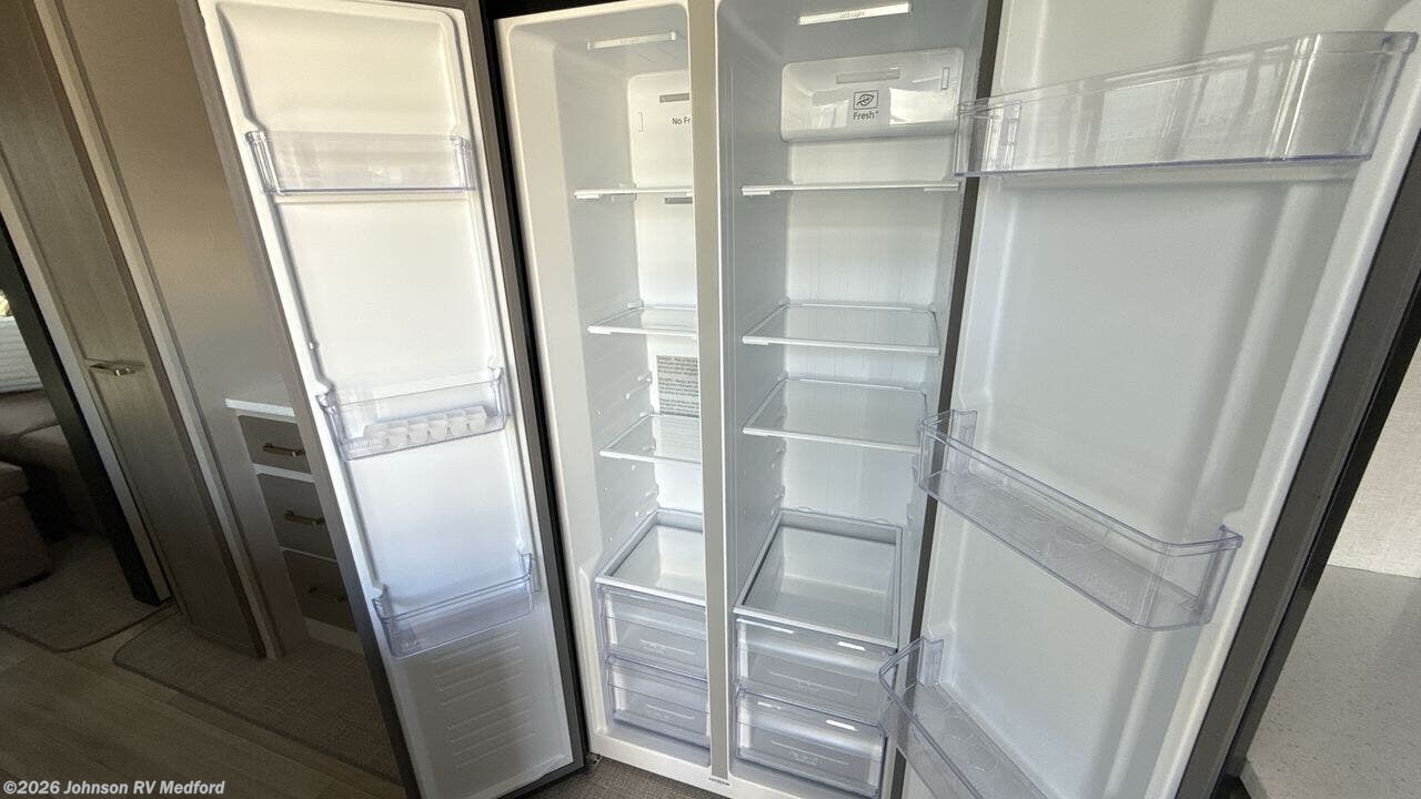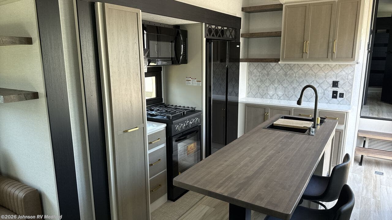 The 2025 Forest River Salem Hemisphere 38VERANDA redefines fifth-wheel living by seamlessly integrating indoor luxury with outdoor versatility. Measuring 43 feet 3 inches in length, this model features a unique rear veranda, offering an open-air space for relaxation and entertainment. Inside, the spacious layout includes four slide-outs, a sectional sofa with an ottoman, a 65" LED Smart TV, and a fireplace, creating a cozy living area. The kitchen is equipped with a 16 cu. ft. 12V French door refrigerator, a kitchen island with seating, and a hutch, providing ample space for meal preparation and dining. The front private bedroom boasts a custom king bed slide, a dresser, a bench, and washer/dryer prep, ensuring comfort and convenience. Constructed with laminated "Aluma Frame" sidewalls, block foam insulation, and a WeatherShield one-piece fiberglass roof, the 38VERANDA is designed for durability and year-round comfort. Additional features include a 17' electric awning with LED lights, an outdoor kitchen, and JBL interior/exterior speakers, making it ideal for both short getaways and extended stays.