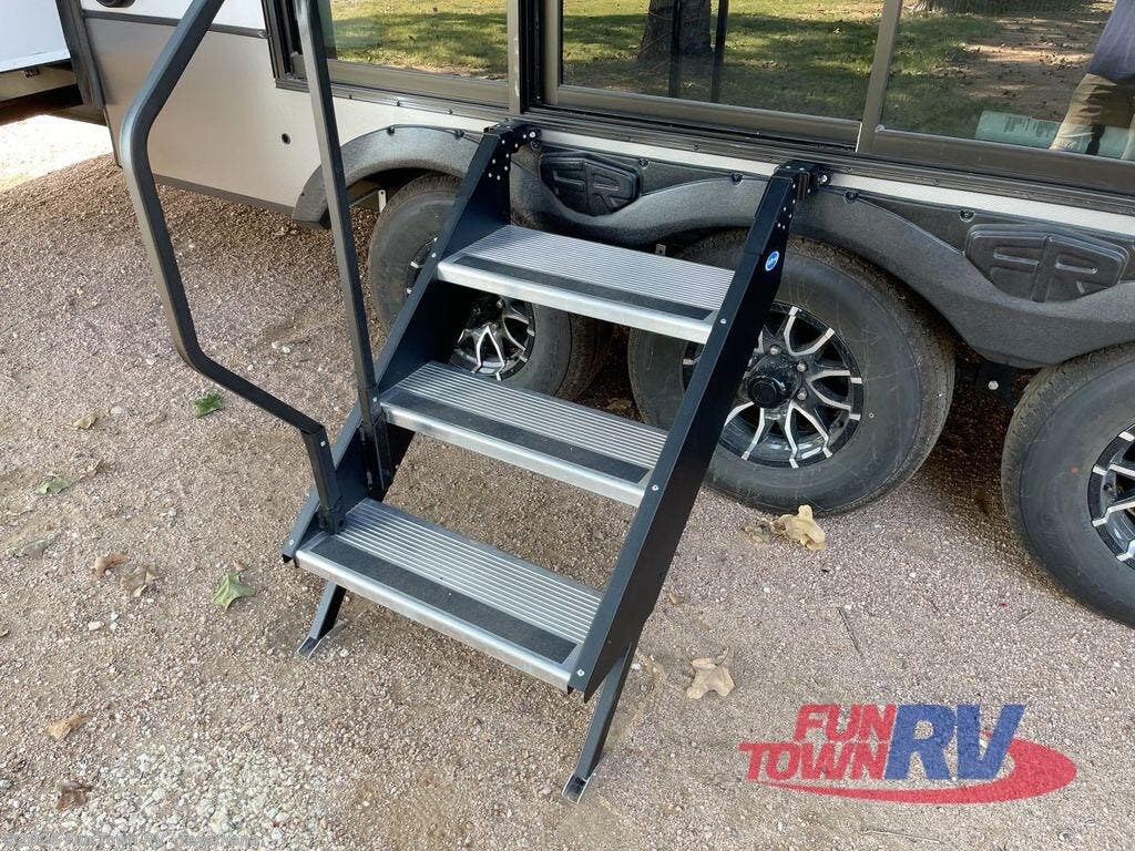 The Salem Hemisphere ROOST fifth wheels resemble a destination trailer that will be giving you residential vibes! The premium Alley Grey high-gloss gel coat fiberglass sidewalls are ultra sleek, and the flat pitched roof sheds water to the off-door side for added comfort. A Race Track A/C duct system provides maximum cooling, and the AccessiBelly underbelly with 12V tank heaters on all holding tanks will help extend your camping season. There are high-end solid surface and maple-stained wood countertops inside, along with residential-inspired wood door casings, and 6' 8" clearance in all rooms, excluding lofts. Additional features include a Gun Metal grey kitchen sink, backlit mirrors in the bathrooms, motion sensor lights by the spiral stair cases, and back up camera prep if you want the option to make parking easier than ever.