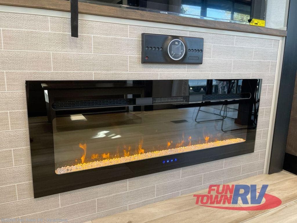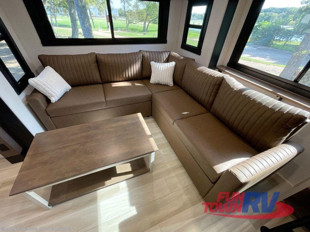 Introducing a new RV of its kind, the ROOST43 is a destination-style fifth wheel you are sure to love! There are two levels, making it feel more like home, and you can sleep six to eight each night. The master bedroom includes a custom king bed slide out, a 32" TV and fireplace, a desk/vanity, plus a half bath for convenience. A custom king-size bed is also found in the front loft, and there are storage cubbies plus a coax/110V outlet here to plug in chargers or a laptop. The second loft in the back includes spiral stairs, two bunk mats, a wardrobe, and cubby cubes here also for your guests' things. Some of the stand-out features you'll find on the first level are the sectional sofa with a coffee table, an entertainment center with a 65" TV, a kitchen island with five chairs, and a fully-equipped kitchen. The 20 cu. ft. 12V refrigerator and pull-out pantry will let you stock up on food, and the kitchen hutch will be perfect for nice dishes. The full bath on this model is one to remember; there is a one-piece fiberglass shower with a teak seat, a flip-up shelf and a washer/dryer, a backlit mirror, and more. And we haven't even touched on the exterior features, such as the pull-out tray, outdoor refrigerators, 20' awning, and more!
