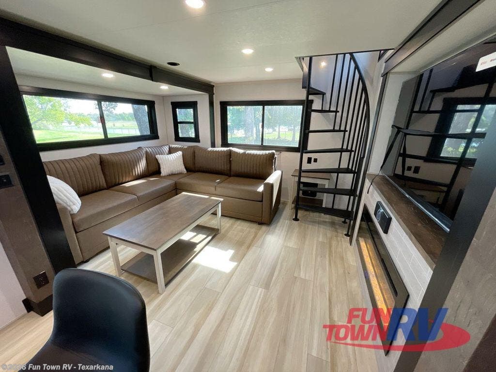 Introducing a new RV of its kind, the ROOST43 is a destination-style fifth wheel you are sure to love! There are two levels, making it feel more like home, and you can sleep six to eight each night. The master bedroom includes a custom king bed slide out, a 32" TV and fireplace, a desk/vanity, plus a half bath for convenience. A custom king-size bed is also found in the front loft, and there are storage cubbies plus a coax/110V outlet here to plug in chargers or a laptop. The second loft in the back includes spiral stairs, two bunk mats, a wardrobe, and cubby cubes here also for your guests' things. Some of the stand-out features you'll find on the first level are the sectional sofa with a coffee table, an entertainment center with a 65" TV, a kitchen island with five chairs, and a fully-equipped kitchen. The 20 cu. ft. 12V refrigerator and pull-out pantry will let you stock up on food, and the kitchen hutch will be perfect for nice dishes. The full bath on this model is one to remember; there is a one-piece fiberglass shower with a teak seat, a flip-up shelf and a washer/dryer, a backlit mirror, and more. And we haven't even touched on the exterior features, such as the pull-out tray, outdoor refrigerators, 20' awning, and more!