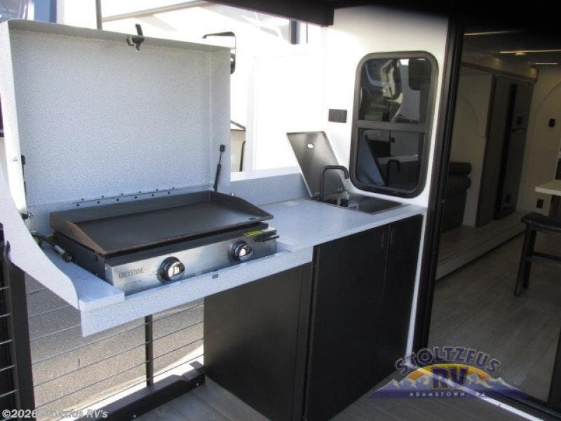 This travel trailer will feel more like home with its rear veranda/porch, dual entry doors, and front master bedroom! There is an outdoor kitchen on the back porch so you can make lunch in the fresh air, and the patio doors lead right into the main living area. Your crew can relax on the L-shaped sofa across from the fireplace, which will make your space more cozy. The U-shaped kitchen counter includes a pull-out table for even more counter space, and the walk-thru bath is easily accessible for everyone to use. You will love having your own space in the master bedroom, and the Versa-Tilt custom king bed will let you sit up in bed to read your book at night. One of the dual entry doors is also found here for added convenience!
