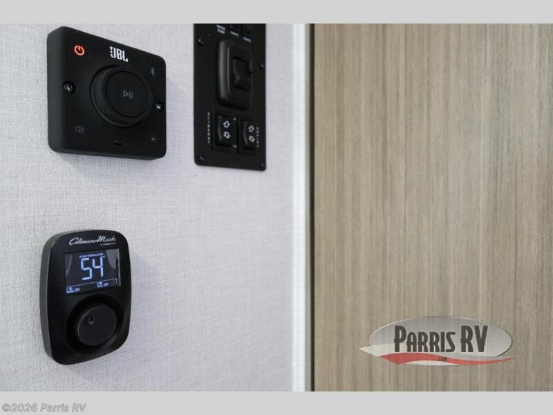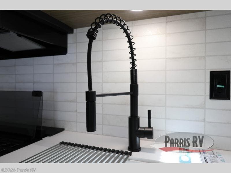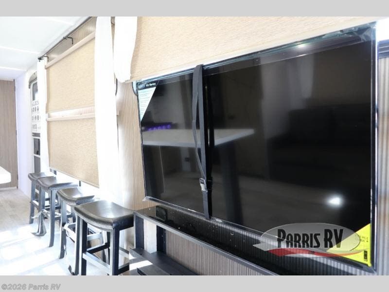 This travel trailer will feel more like home with its rear veranda/porch, dual entry doors, and front private bedroom! There is an outdoor kitchen on the back porch so you can make lunch in the fresh air, and the patio doors lead right into the main living area. Your crew can relax on the L-shaped sofa across from the fireplace, which will make your space more cozy. A kitchen island with four chairs will provide a place to dine at, and there is a spacious pantry and refrigerator for food storage. You will love having your own space in the private bedroom, and the Versa-Tilt custom king bed will let you sit up in bed to read your book at night.