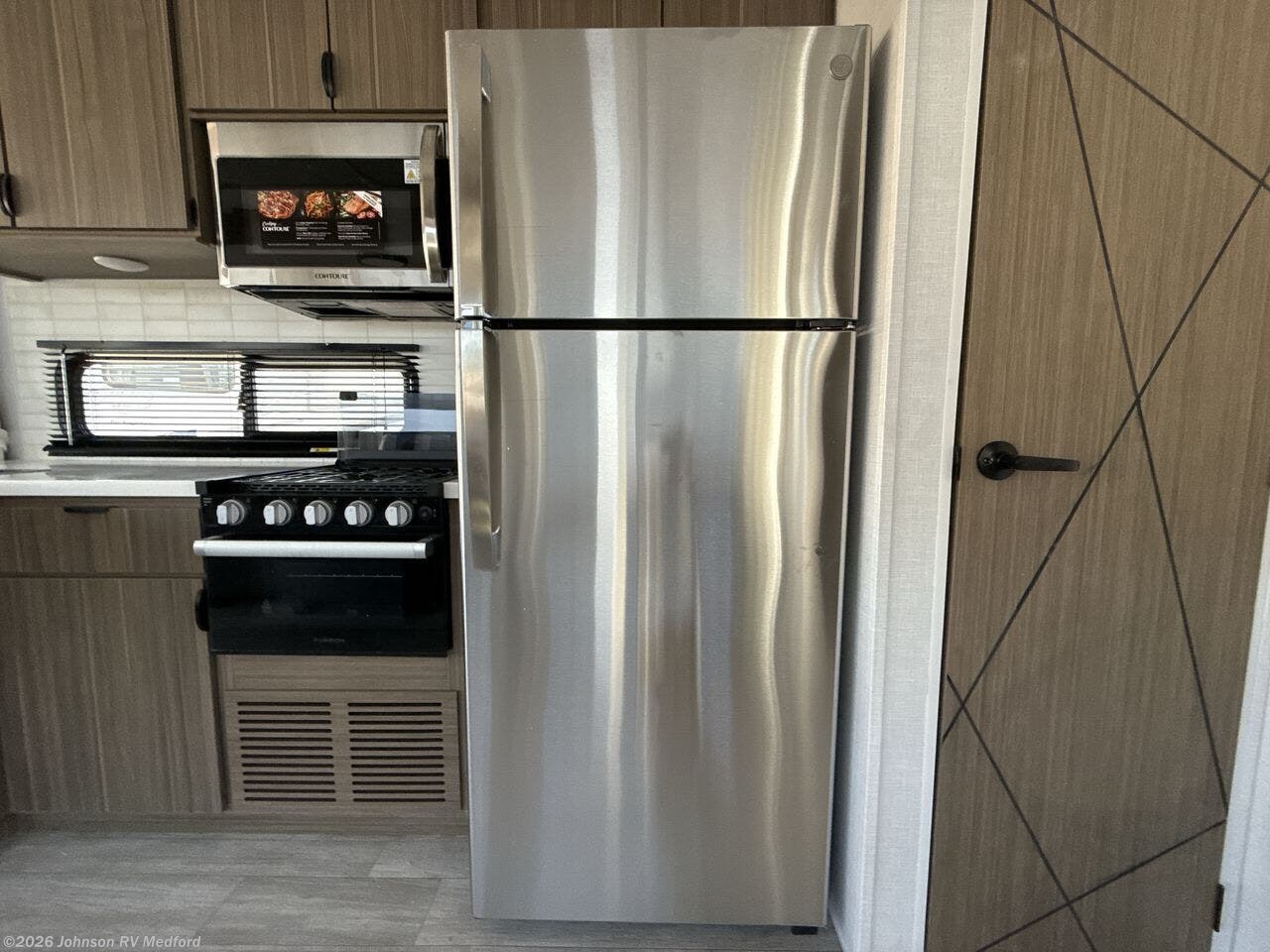 The 2025 Salem 40FDEN delivers refined living in a full-featured fifth wheel designed for family comfort and extended travel. Stretching over 40 feet, it includes a luxurious front den perfect for work, relaxation, or entertaining, complete with a convertible sofa, desk area, and overhead storage. Step into the central main living space where an expansive kitchen awaits, featuring a full-size residential refrigerator, three-burner range, microwave, and a central island with deep sink. The adjacent dining area and lounge include dual-seating options and a second entertainment center, making it an inviting suite for everyday living. The private rear master bedroom houses a walk-around king bed, dual wardrobes, and a dresser, creating a restful private retreat. Nearby, a spacious bathroom features a large shower with seat, toilet, dual vanity, and linen closet, delivering the luxury and convenience of home.