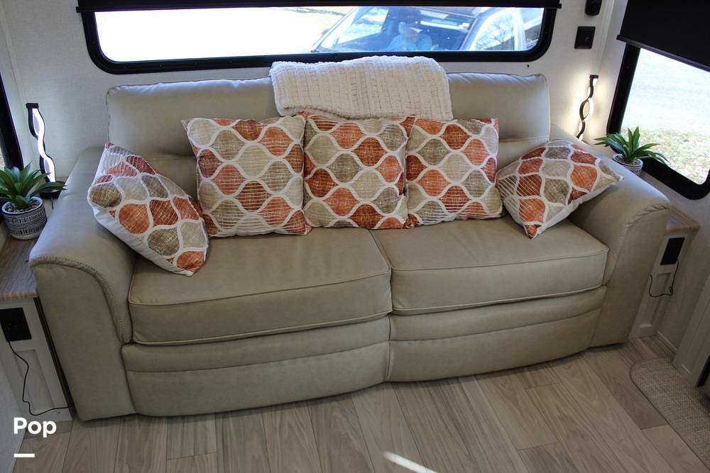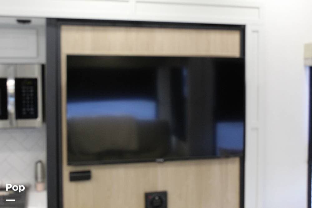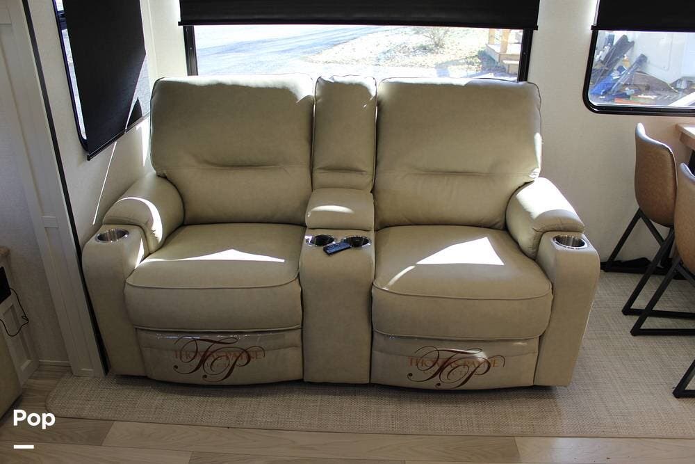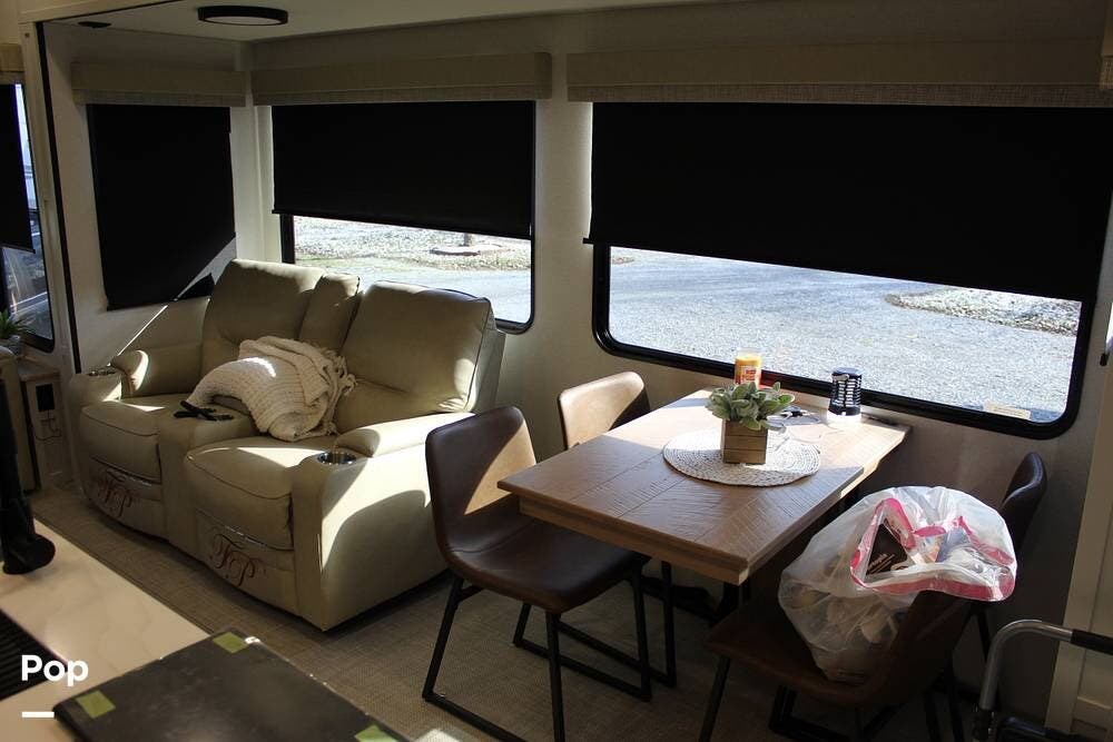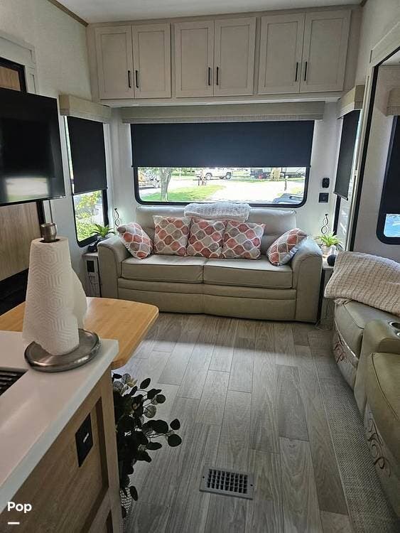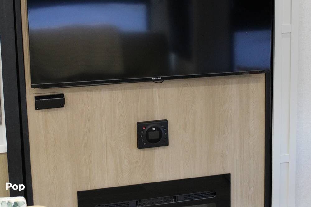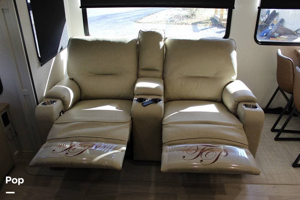 Upon entering its spacious entry, the over 300 sq ft of living area is quite impressive. The living area has a sleeper sofa, two electric recliners, and a large 50-inch TV with JBL surround sound.